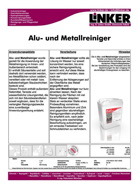 Alu- und Metallreiniger wurde gezielt für die Anwendung der Metallreinigung im Innen- und Außenbereich entwickelt. Er enthält Säureanteile und soll deshalb dort verwendet werden, wo Metallflächen schon oxidiert, verwittert oder mit metall- bzw. kalksteinhaltigen Staubschichten bedeckt sind.