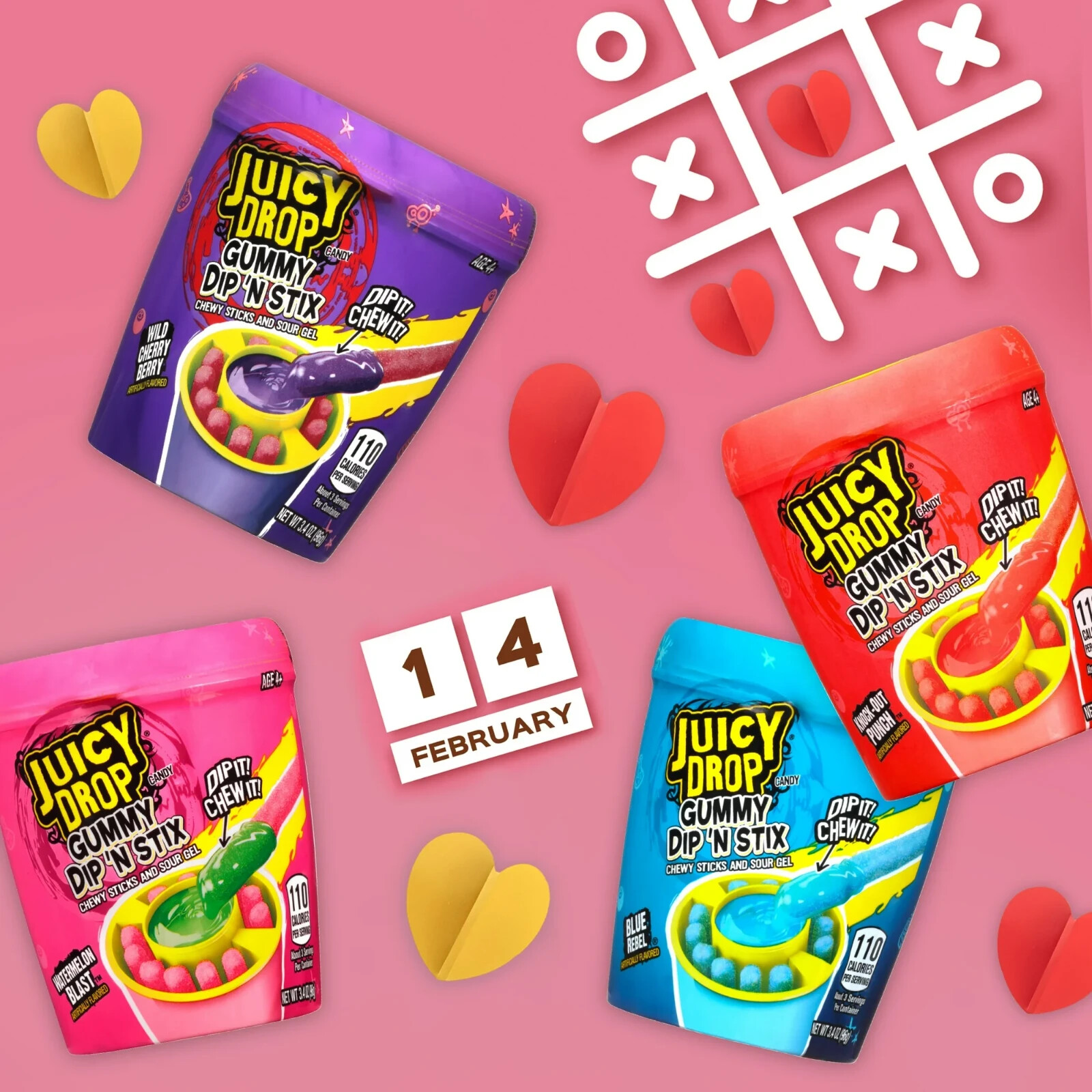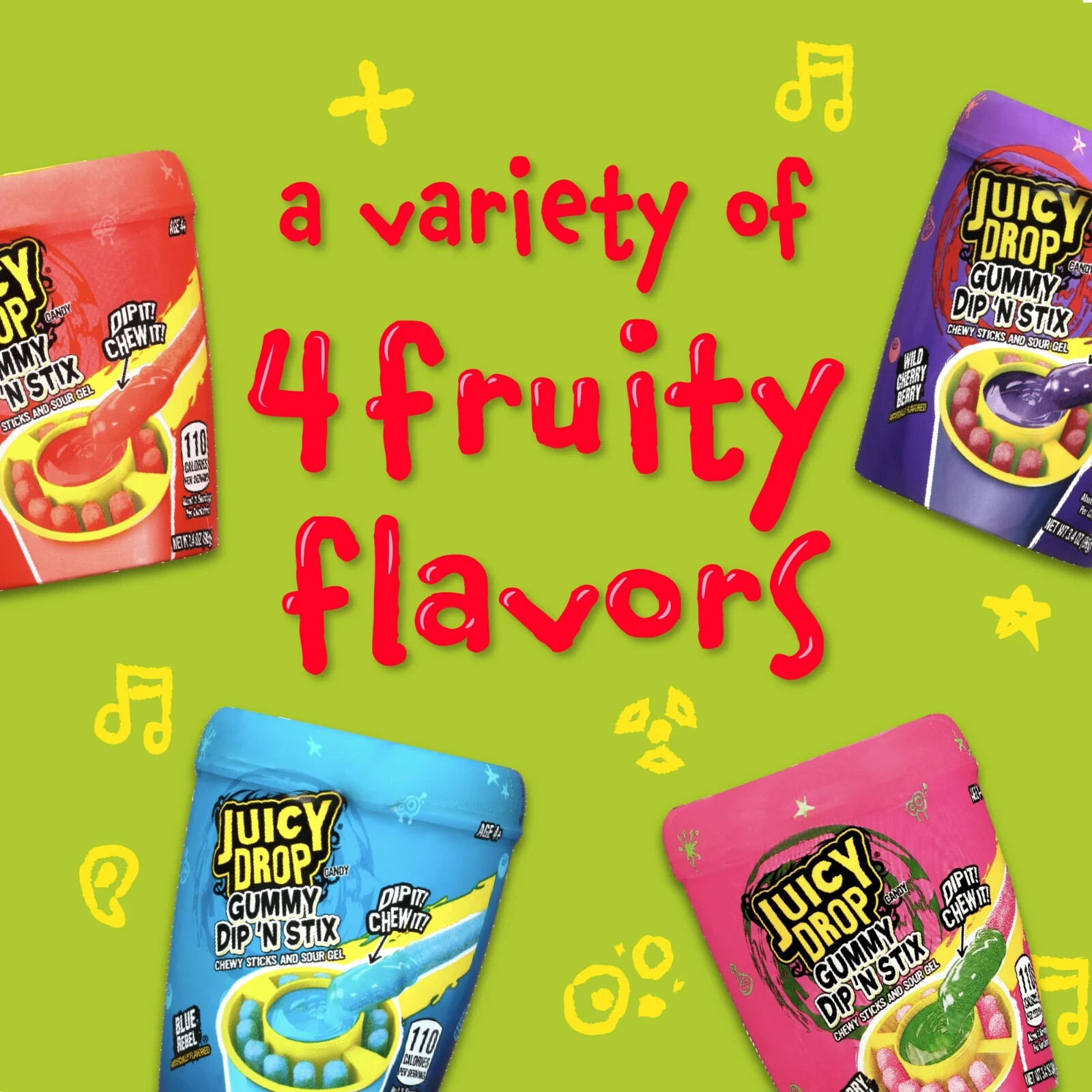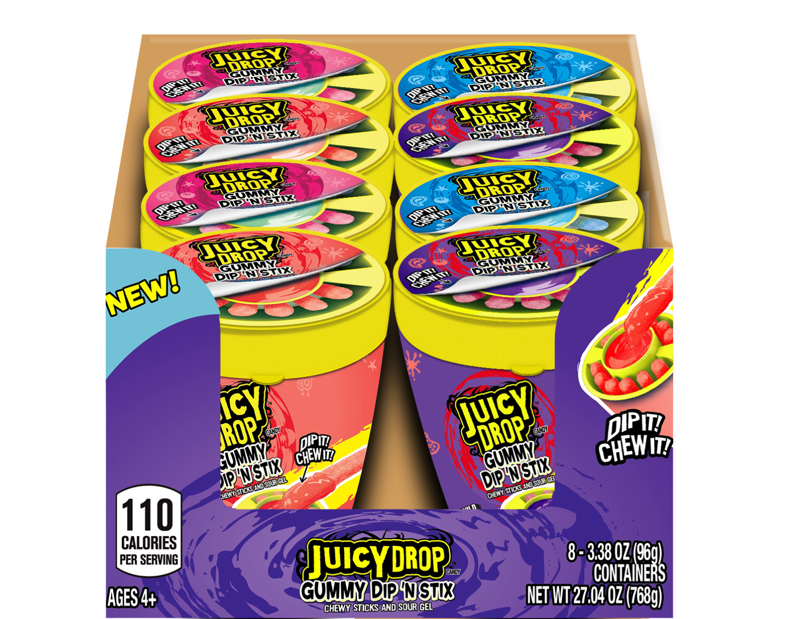Juicy Drop® Gummy Dip ‘N Stix is packed with sweet gummy stix and sour gel so you can dip, and dip, and dip anywhere! Wherever you take it, you can have your dip, your way! Comes in an assortment of fruity flavors: Knock-Out Punch, Blue Rebel, Wild Cherry Berry, and Strawberry Watermelon.