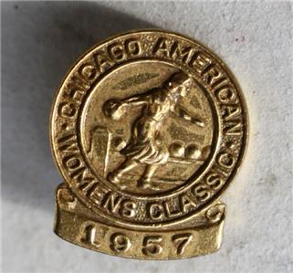 Here is a great vintage Tiny Gold Color 1957 Chicago Illinois Chicago American Women's Tournament Bowling Woman Bowling Tiny pinback pin. Good Used Condition-SEE ALL PHOTOS. It measures about 3/4 inches tall by about 3/4 inches wide. Grab this great Bowling Pinback Pin Collectible while you still can it will not last long.