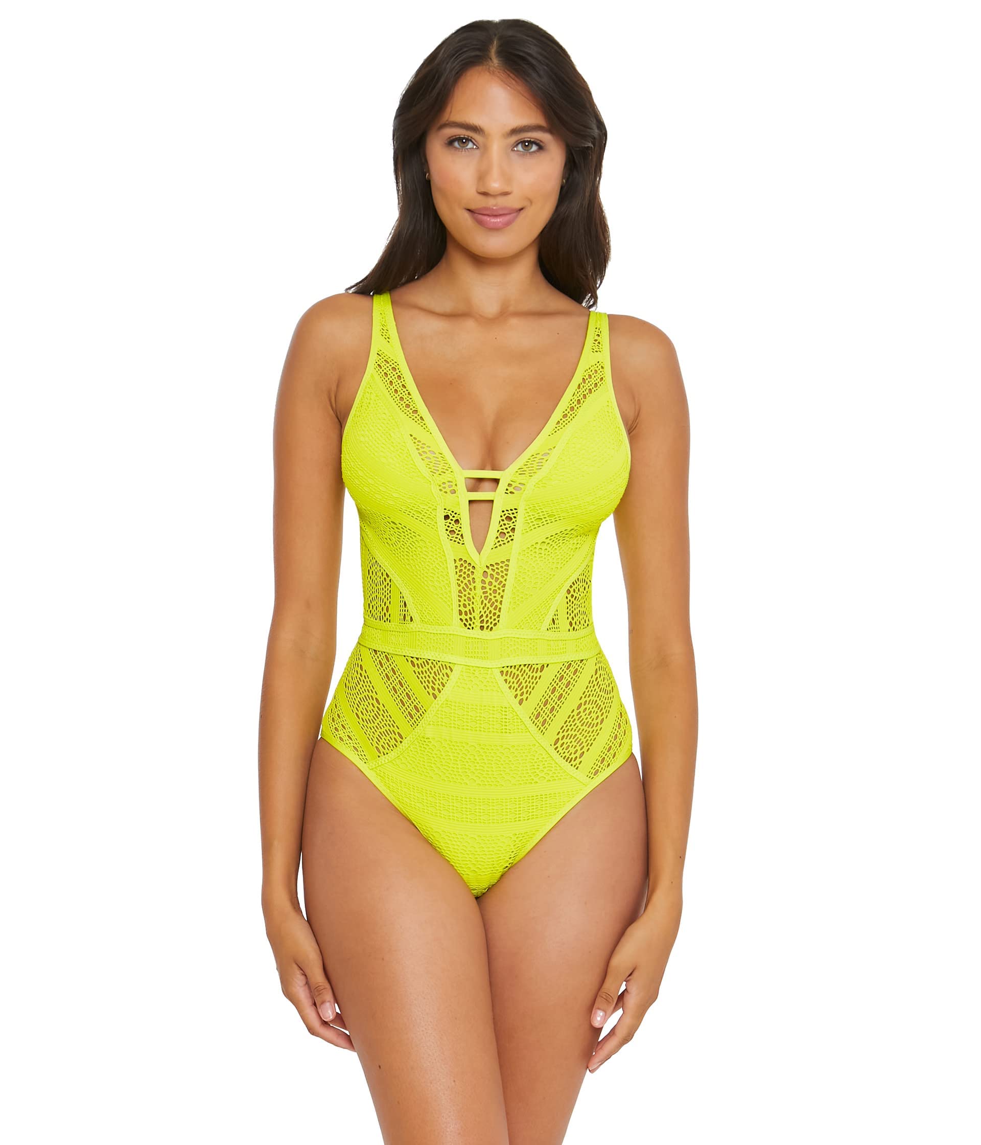 Enjoy the splashes and embrace the sun wearing the BECCA by Rebecca Virtue Color Play Crochet Plunge One-Piece that looks chic. High leg cut design. Plunging V-neckline and sleek shoulder straps. Mid-open back. Cutout detail on the back. Tie-up detail on the back. Pull-on construction. Crochet design on the front. 91% nylon, 9% spandex. Hand wash, line dry.