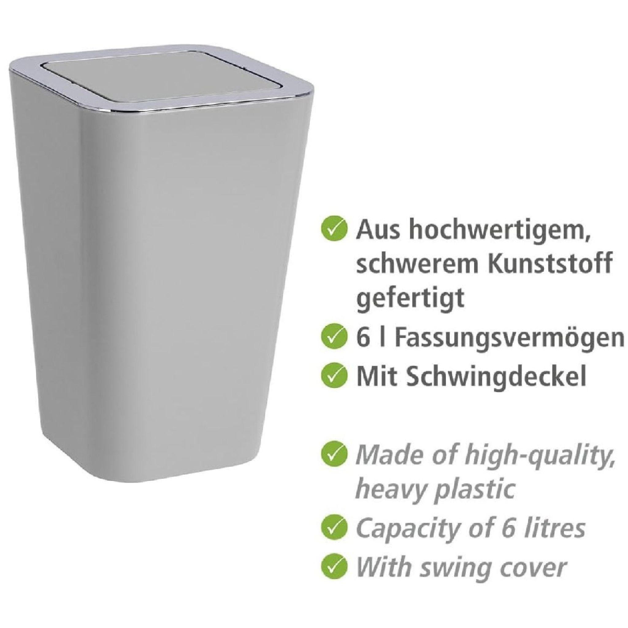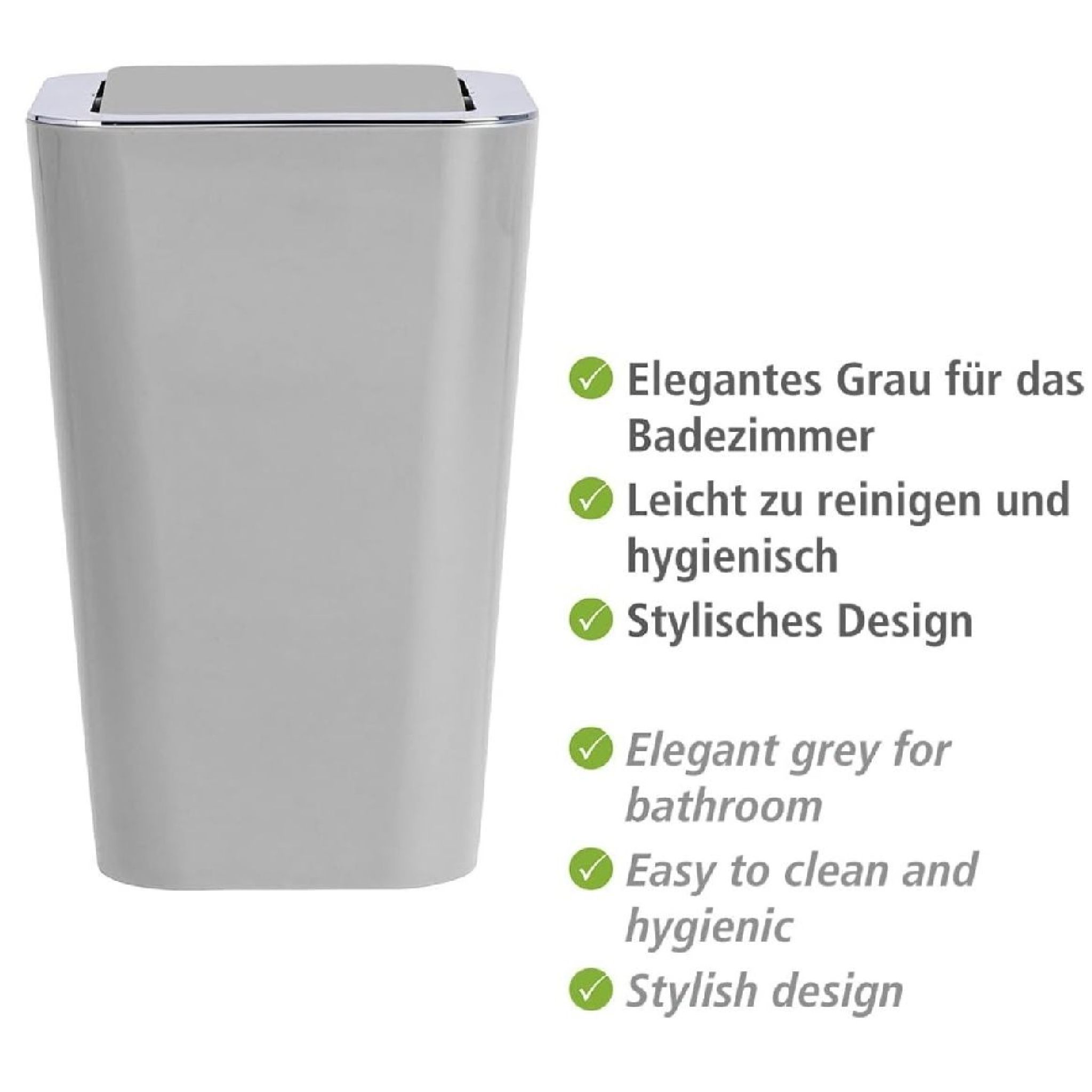 Der Wenko Schwingdeckeleimer Candy Grey ist ein stilvoller Abfalleimer, der sich ideal für Badezimmer oder Haushalte eignet. Gefertigt aus hochwertigem, schwerem Kunststoff, überzeugt er durch seine elegante graue Farbe und verchromte Details. Mit einem Fassungsvermögen von 6 Litern bietet er ausreichend Platz für Abfälle. Die glatte Oberfläche erleichtert die Reinigung und sorgt für besondere Hygiene. Dank des Schwingdeckels ist eine einfache Bedienung gewährleistet, und der Inhalt bleibt stets verborgen. Mit seinen kompakten Maßen von 18 cm Breite, 28,5 cm Höhe und 18 cm Tiefe passt er perfekt in jedes Bad oder Gäste-WC. Der Eimer ist BPA-frei und somit umweltfreundlich.