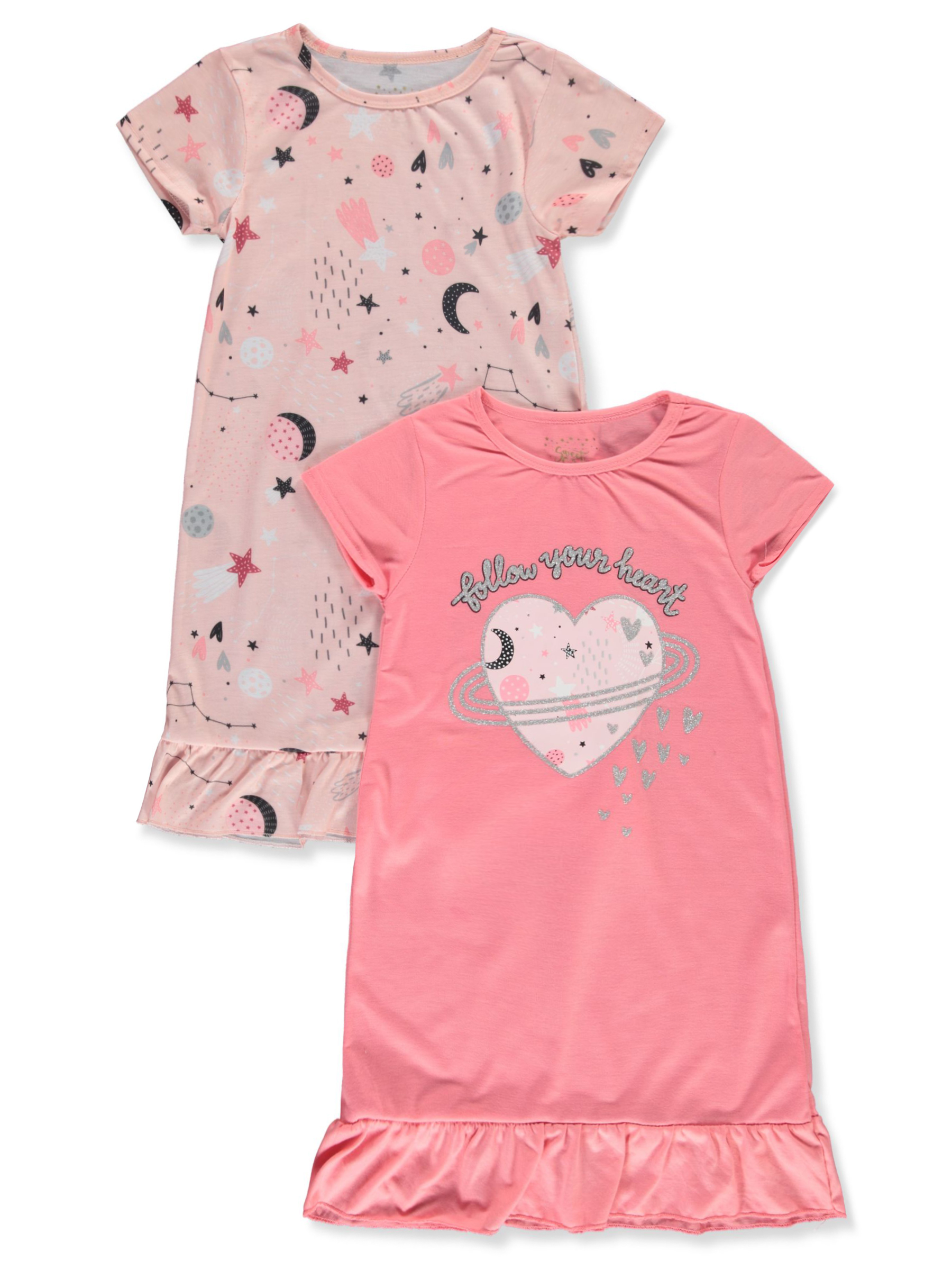 Stock up with this 2-pack from Sweet & Sassy! Sweet & Sassy nightgowns Patterns / designs as shown T-shirt fit Stitched hem 100% polyester Machine wash cold Made in China