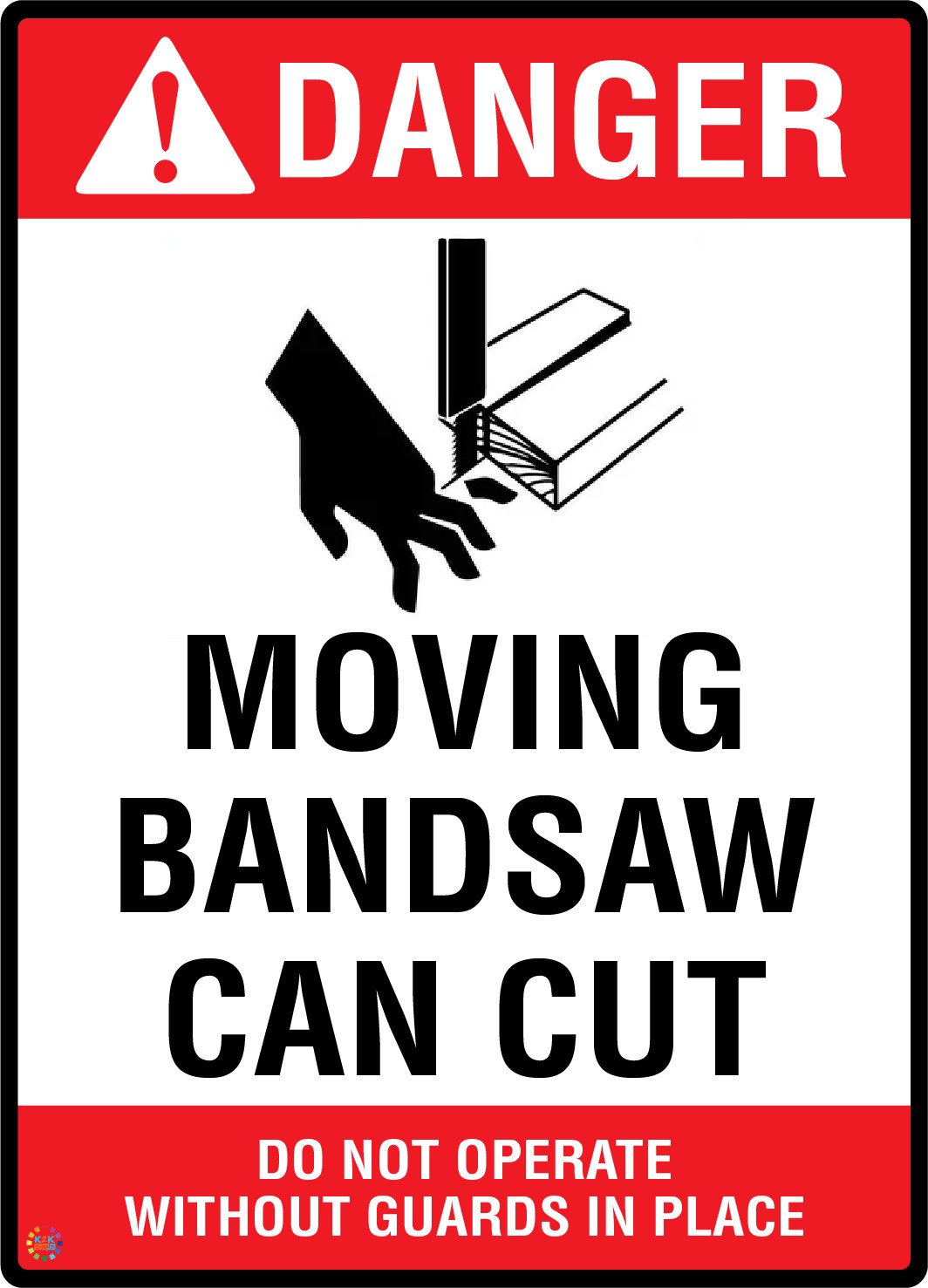 The Danger Moving Bandsaw Can Cut Do Not Operate Without Guards In Place Sign/Sticker (DSM13) is a crucial safety notice designed to prevent serious injury or fatal accidents in environments where bandsaws are in use. This sign/sticker clearly warns all operators and personnel of the severe hazards posed by unguarded rotating blades and reinforces the importance of using the equipment only when all protective guards are correctly installed. Essential for workshops, manufacturing plants, timber yards, and metalworking facilities. It supports workplace safety compliance and helps cultivate a safety-conscious culture by reminding users that bypassing guards is both dangerous and a breach of standard operating procedures. Proudly manufactured in Australia and compliant with AS 1319 standards.