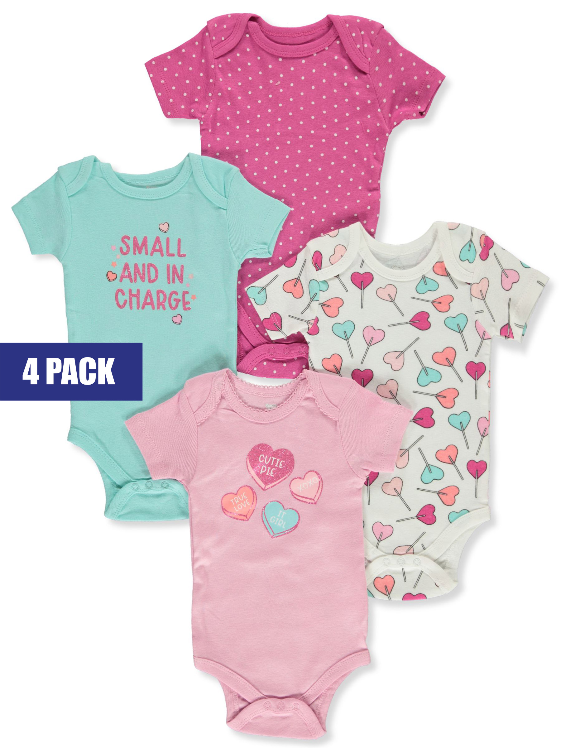 Stock up with this 4-pack from Koala Baby! Koala Baby bodysuits Cotton construction Graphic applique Lap shoulders Easy-change snaps 100% cotton Machine wash cold Made in China