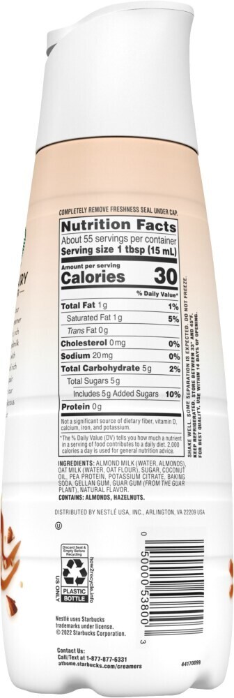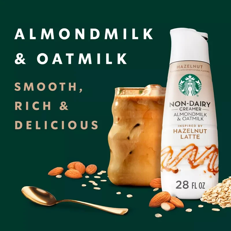 Almond milk (water, almonds), oat milk (water, oat flour), sugar, coconut oil, pea protein, potassium citrate, baking soda, natural flavor, gellan gum, guar gum (from the guar plant). Contains: Almonds. Hazelnut.