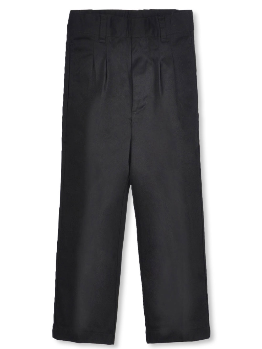 These French Toast pants are a comfortable school classic. They're made of pre-creased, Wrinkle No More twill, with reinforced knees for durability. They feature a pleated front, a single welt back pocket, on-seam front pockets, and a hook and eye closure. An adjustable elastic waistband provides growing room.60% Cotton, 40% Polyester Machine Wash Cold Made in Indonesia