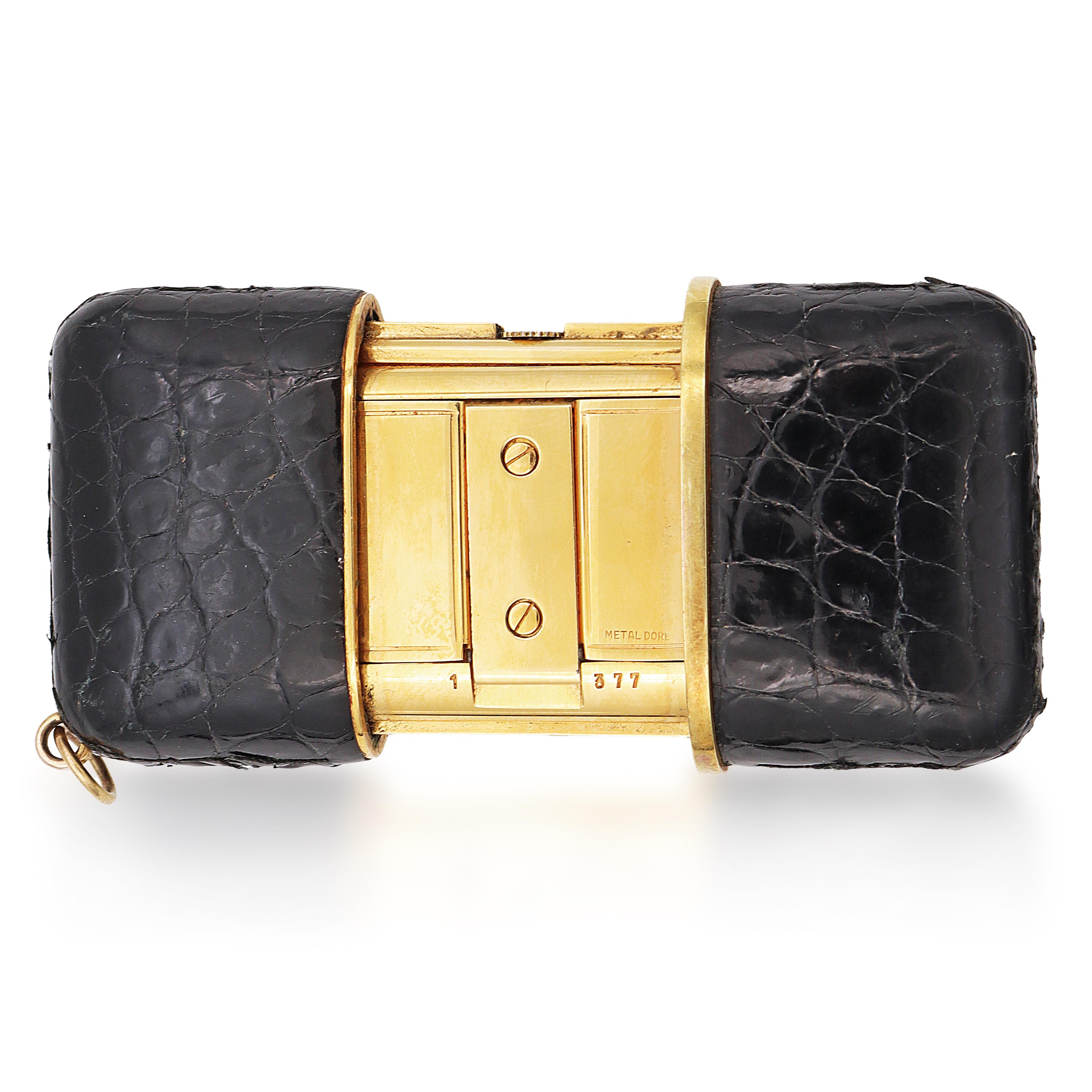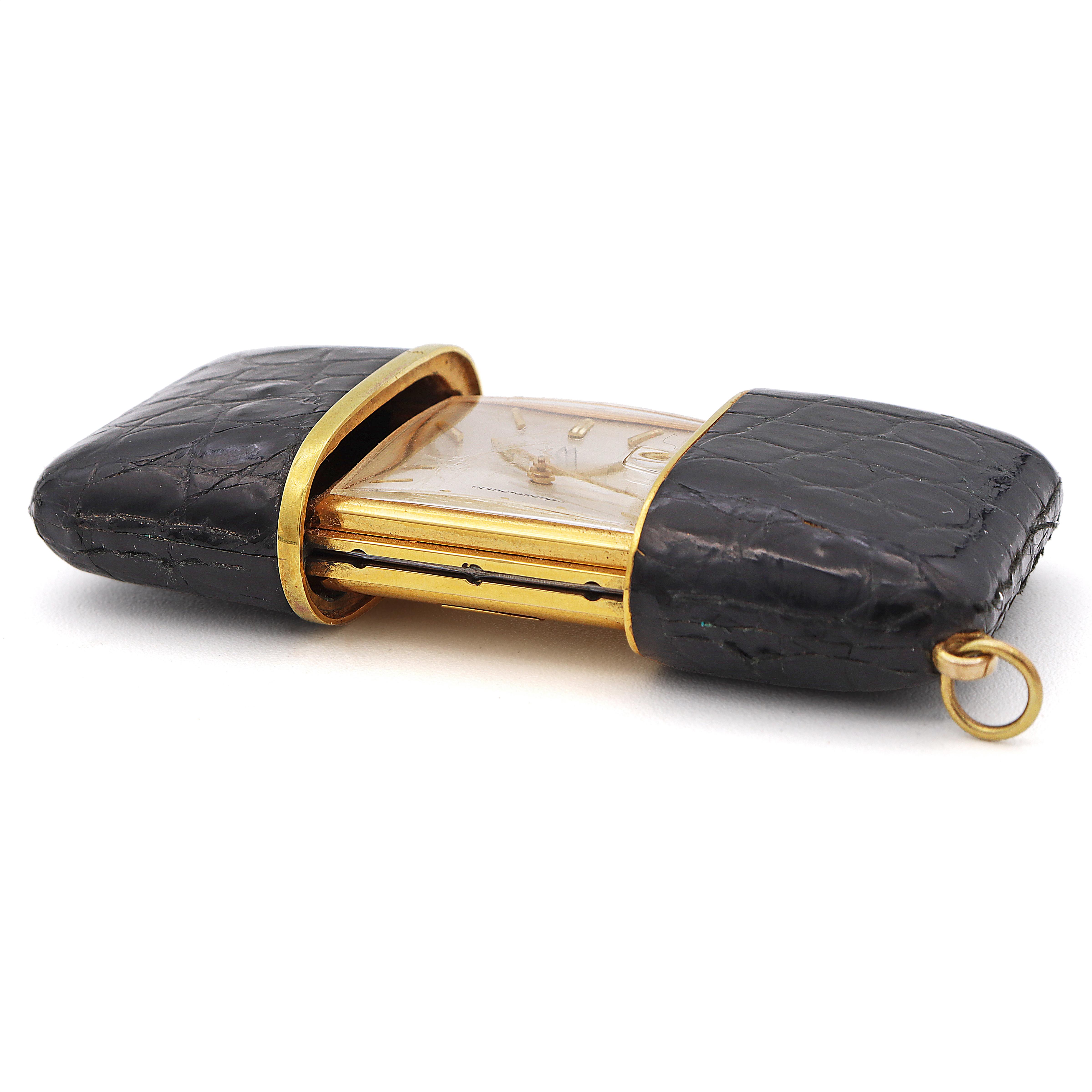 This distinctive Movado Ermetoscope watch boasts a unique sliding case design with a textured black exterior, exuding both innovation and style. The watch features a sleek rectangular gold-tone frame, which houses a crisp white dial with elegant gold hour markers and hands. A date indicator at 3 o'clock adds functional sophistication, while the manual movement ensures precise timekeeping. This watch seamlessly blends modern design with timeless craftsmanship, making it a standout piece for any collection.