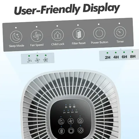 • Touch Panel & Widely Used: Six smart touch screen buttons with Speed, Sleep Mode, Child-Lock, 2H/4H/6H/8H Timer, Filter Replacement Indicator. hepa air purifiers for home Modern design suits any space from small to large rooms, bedrooms, living rooms, offices, nurseries, kitchens, and basements.