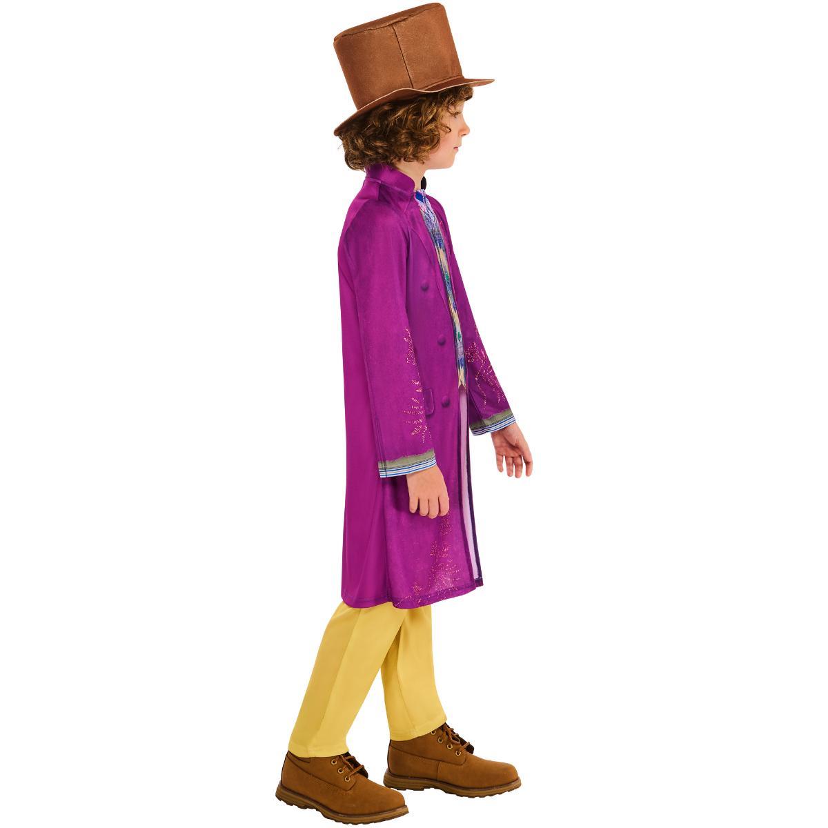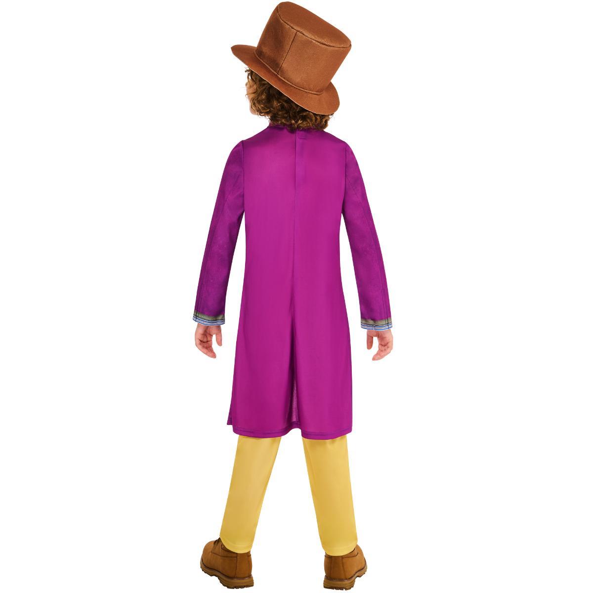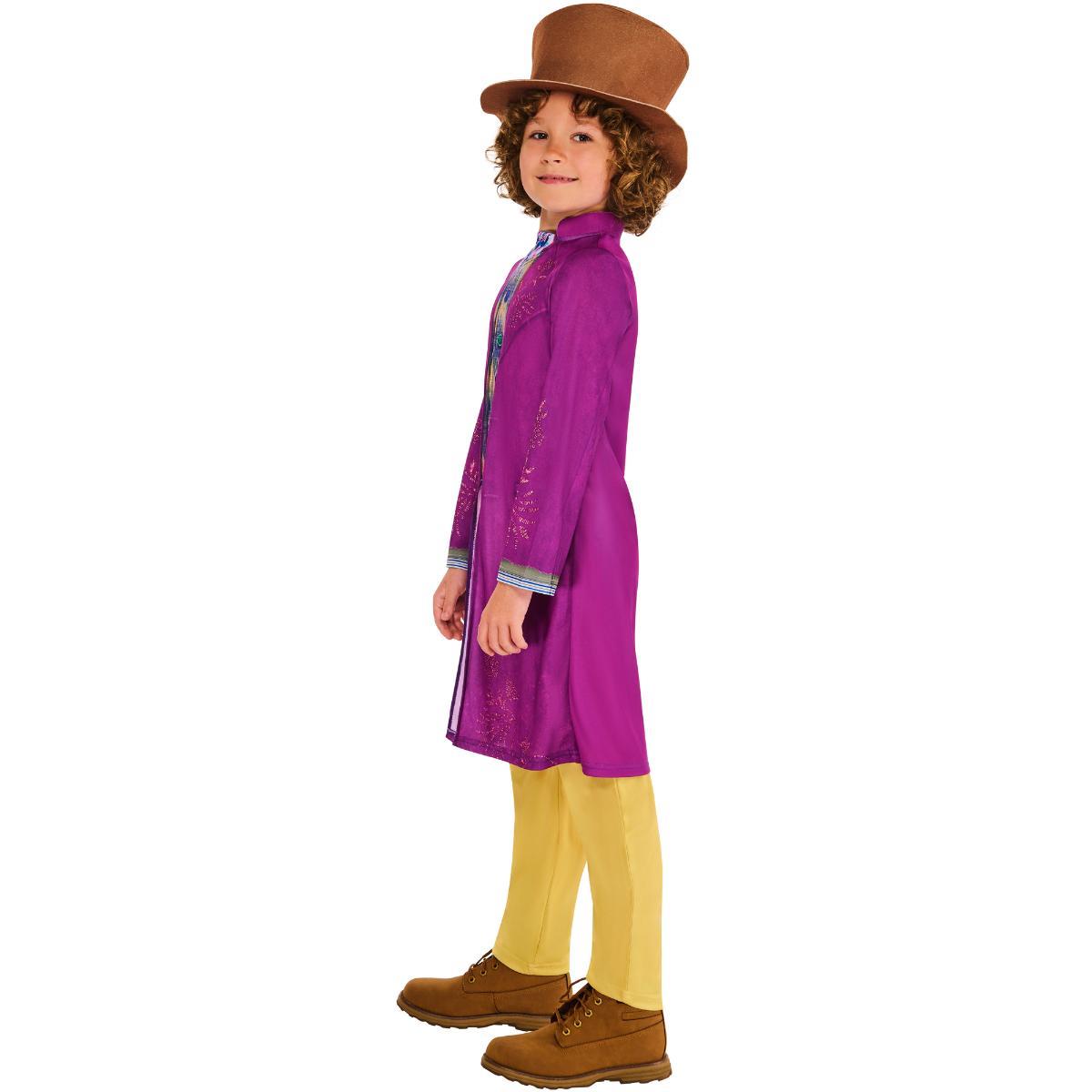 Description: Let your child step into the whimsical world of Willy Wonka with the Wonka Child Costume! This magical costume set features a purple coat, yellow trousers, a stylish waistcoat, and a classic brown top hat, inspired by the iconic look of Willy Wonka from the beloved story. Perfect for Halloween, themed parties, or school plays, this costume will have your child ready for their own adventure in the chocolate factory