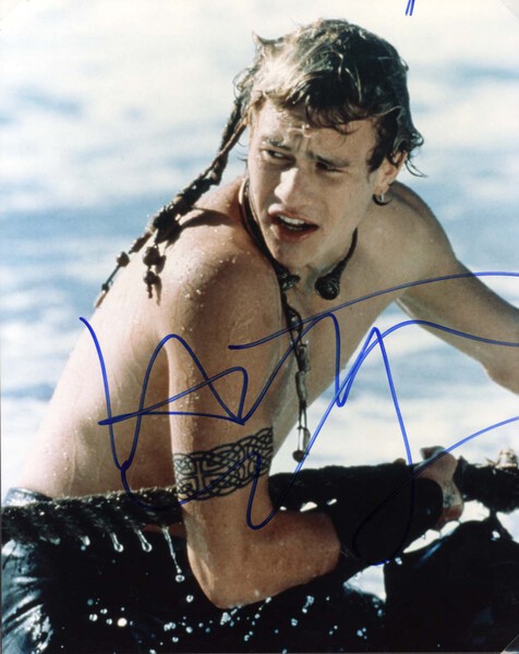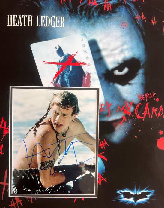Signed photograph, shows Heath Ledger in a film scene, 8 x 10 inch, signed in blue felt tip, attractively affixed for fine display to an exclusively designed custom-matting (altogether 15,5 x 19,5 inch), in very fine condition. Accompanied by an additional Certificate of Authenticity (`autograph coa`).