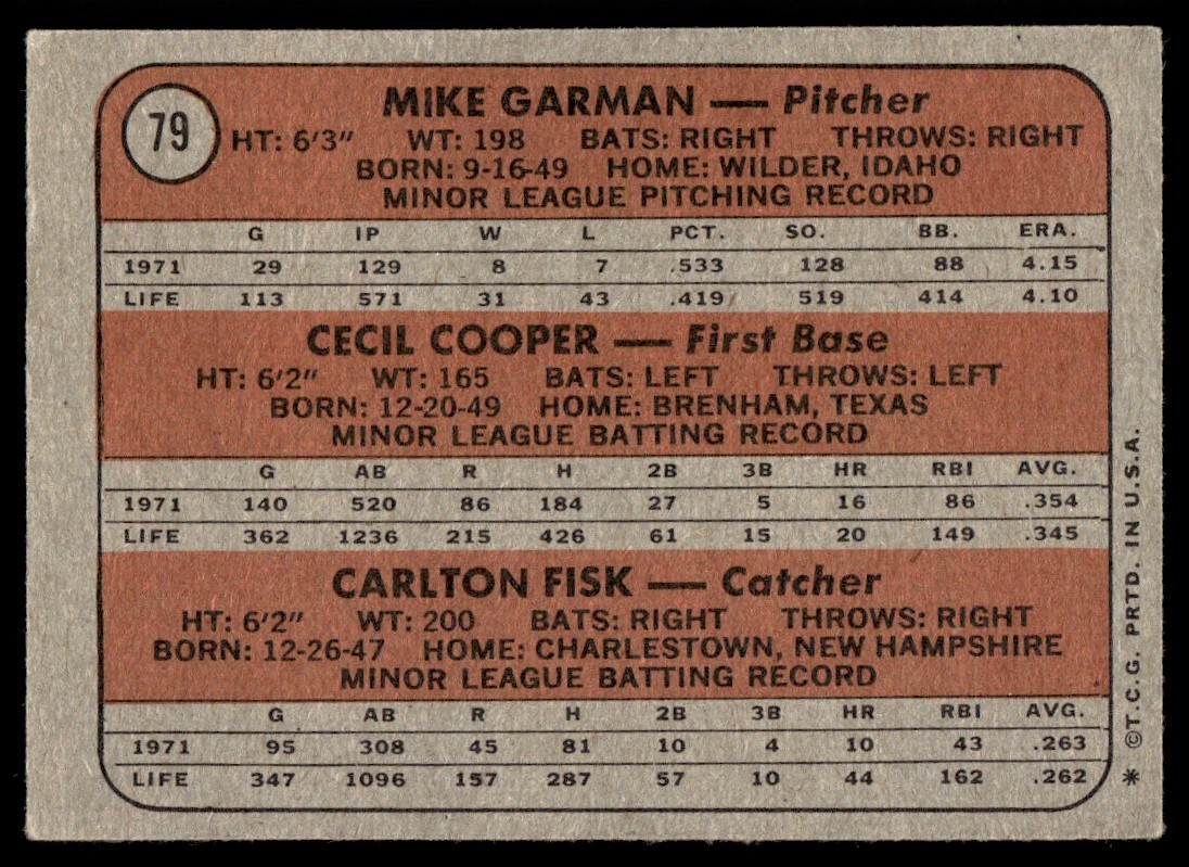 1972 Topps Red Sox Rookies - Mike Garman/Cecil Cooper/Carlton Fisk Rookie Boston