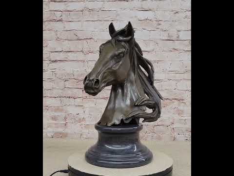 Capturing the essence of equine vitality, this stunning bronze bust of a horse radiates boundless energy and spirit. The horse's dynamic posture suggests a moment of excitement and vigor. With its head bending down toward its body and its flowing mane seemingly defying gravity, it appears as if the horse is mid-buck, its mouth open in a spirited neigh. Every intricate detail of this sculpture has been meticulously crafted, making it a captivating addition to any mantelpiece, shelf, or table.