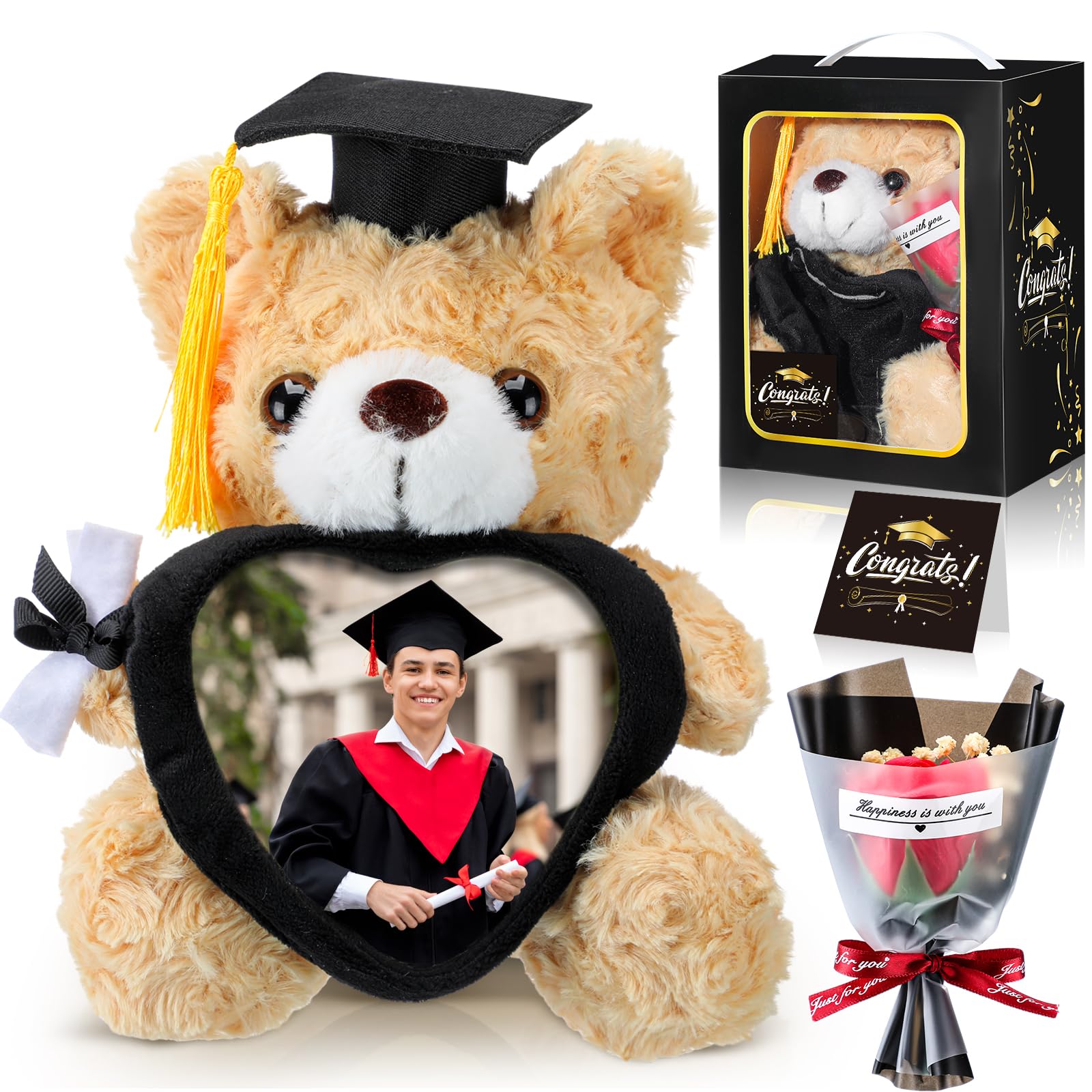 Features: Soft and Cuddly: our carefully designed plush graduation bear is not only a delightful keepsake but also a comforting companion. Its soft texture makes it suitable for cuddling, bringing joy and warmth to new graduates as they embark on their next adventure. Thoughtful and Meaningful: this classic bear, adorned with a graduation cap, holds special significance for graduates from university. It's a cherished gift that conveys heartfelt congratulations and best wishes for their future. Specifications: Material: cotton, paper Color: multicolor Size: Graduation Gifts Box: 7.87 x 6.30 x 4.33 inches Graduation Bear: 9 inches Graduation Card: 3.93 x 3.93 inches Rose: 6 inches Package includes: 1 x Graduation Gifts Box 1 x Graduation Bear 1 x Graduation Card 1 x Graduation Rose Notes: Manual measurement, please allow slight errors on size. The color may exist a slight difference due to different screen displays.