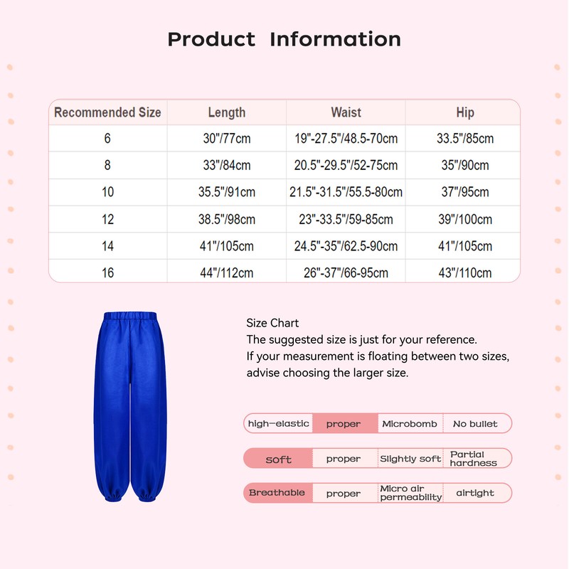 Elastic waist and ankles better fit body shape to provide maximum comfort and allow your child enjoy the dance.