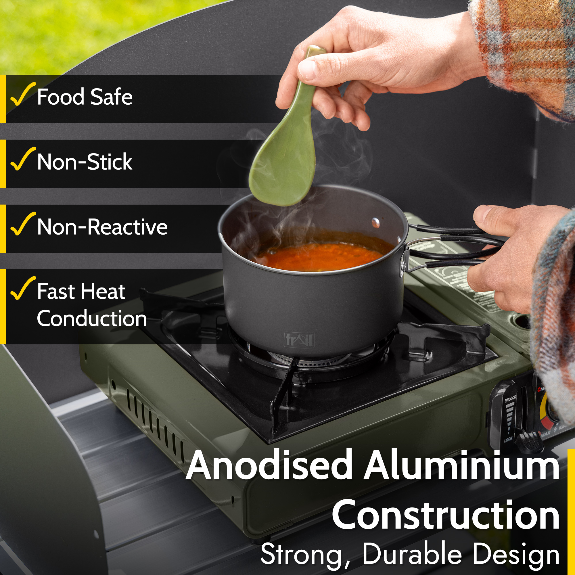 - Durable hard anodised aluminium (non-stick, non-toxic, fast at conducting heat)