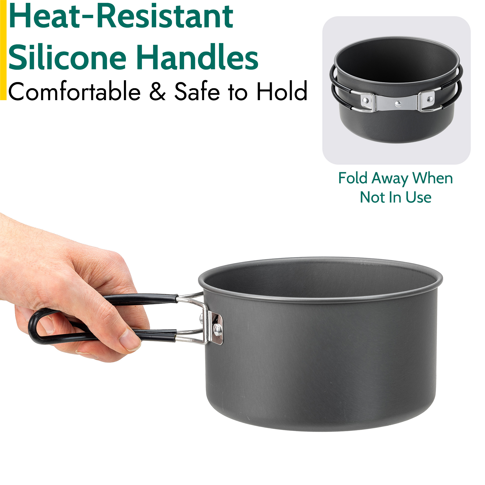 - 1L cooking pot with lid and frying pan with folding heat-resistant silicone handles
