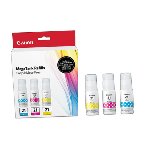 Genuine GI-21 Cyan, Magenta and Yellow Ink Bottles designed specifically for select Canon MegaTank printers. Specialized ink bottles created for each color to fit and fill compatible MegaTank printers easily! Cyan, Magenta and Yellow ink formulation for colorful graphics & images. Ink Volume = 70 ML per bottle