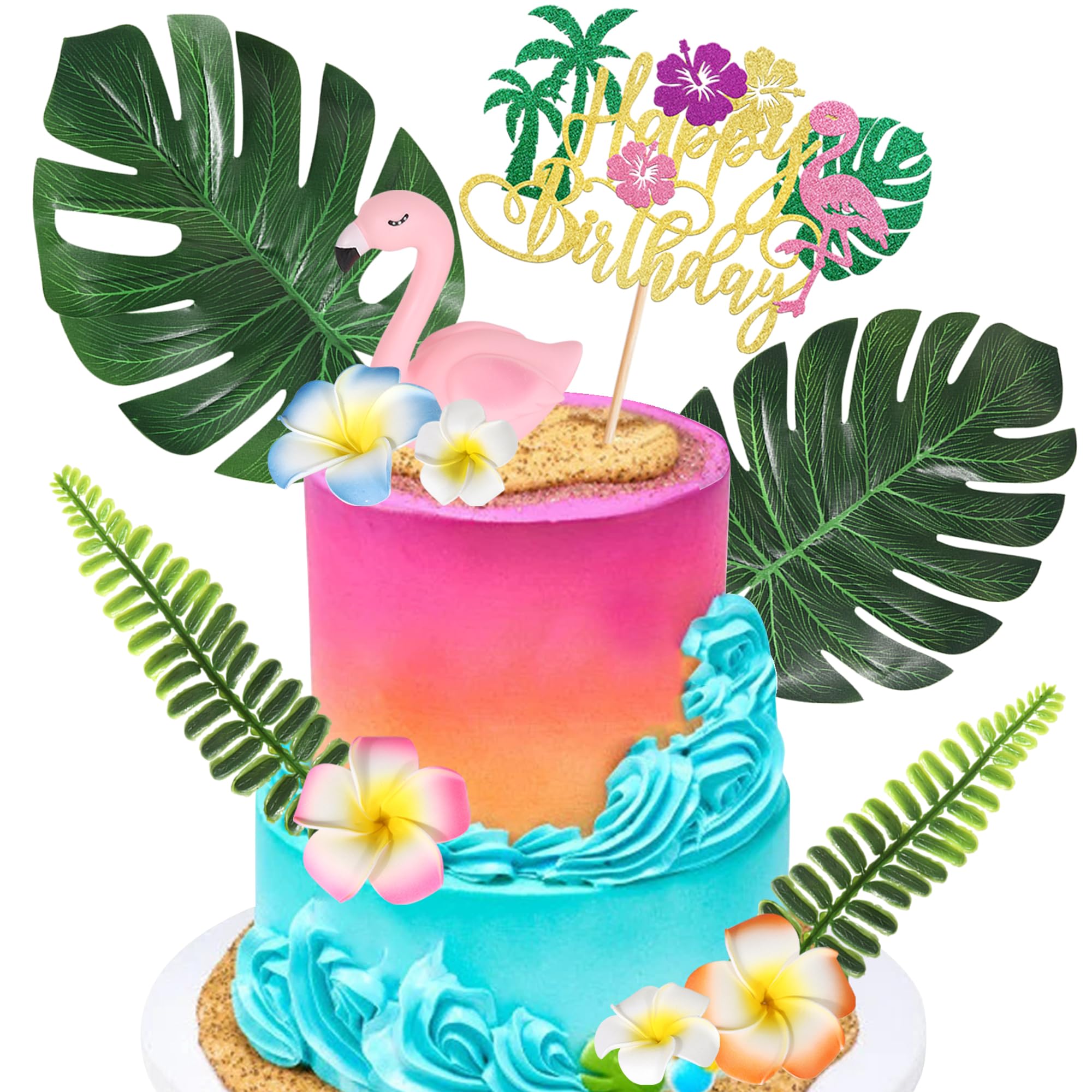 Package includes 1 x big flamingo with size 3.7*4.3, 2 x palm leaves with size 1.7*6.4 , 2 x leaf cake toppers with size 8.7*6.7, 9.5*7.5, 1 x happy birthday cake topper with size 6.6*8.5, 5 x flowers with size 3.0*3.0, 1.8*1.8 ( with stick )