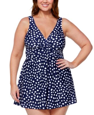 Add a mega dose of glamour to your swim look in this plus size, dot print swim dress from Island Escape.