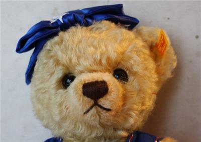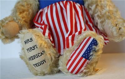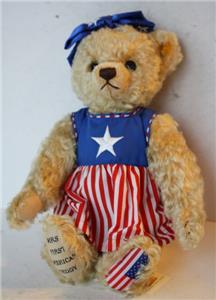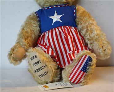 Here is a great little vintage 2003 Steiff Mrs First American Teddy Blonde Mohair Jointed Limited Edition Red White Blue Stars and Stripes Flag on bottom of foot Dress and Hair bow Yellow Tag stitched nose Teddy Bear. It is Adorable. It is marked very well on the ear tag-SEE PHOTOS. It measures about 13 inches tall by about 8 inches wide. This Bear would make a perfect bear for display for any Teddy Bear collector. This wonderful Teddy Bear would make a great addition to any Teddy Bear collection. It is in great shape and has wonderful character. I would keep it but I am pairing down my wonderful Teddy Bear collection. I will be listing lots of Bears over the next couple of months because I have downsized and can no longer display them. So it is with great sadness that I have to part with any of them but I have been told that I have a "Bear Problem" so I must let go of some so my loss can be your gain. Grab this Teddy Bear while you still can and be the envy of all of your friends and family.