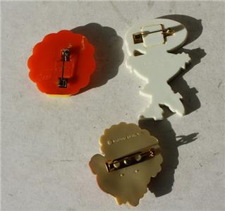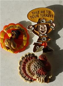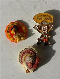 Here is a great set of 3 Holiday Thanksgiving Pins 2 of them are Hallmark pins the other is a Russ pin Happy Turkey Day pin is Russ and the Take me to your Turkey Pilgrim pin and other Turkey pins are Hallmark pilgrim 1982. It is Adorable. SEE ALL PHOTOS. It measures about 1 1/2 inches tall and about 1 inches long. Grab this great little vintage collectibles while you still can it will not last long.