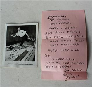 Here is a great vintage authentic Bob Lillard Professional Bowler hand signed Black and White Brunswick Advisory Staff of Bowling Champions Autographed Black and White Bowling Photo and a little note hand written and signed to me. I personally obtained all of these autographs myself all are 100 percent authentic. It is Awesome. It measures about 4 1/2 inches tall by about 3 1/2 inches wide. Great Vintage Bowling Autograph-"To Rhonda Best Wishes" SEE ALL PHOTOS! Grab this great vintage collectible while you still can at this price it will not last long.