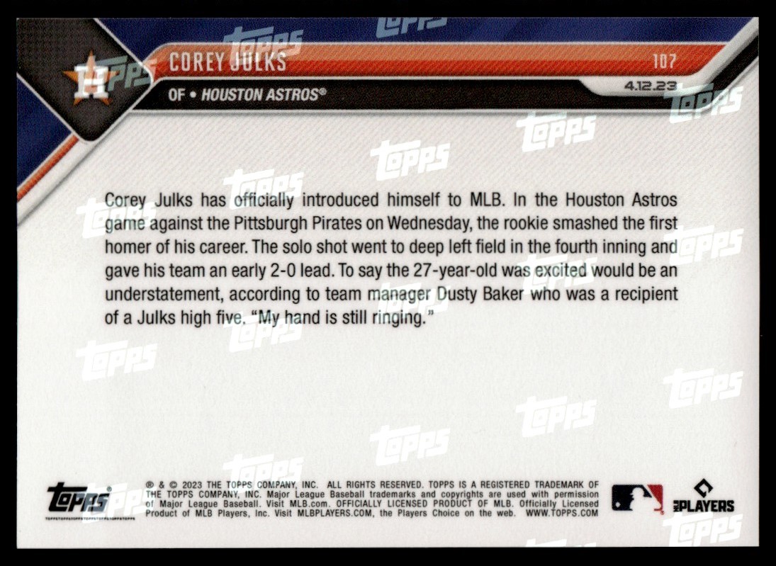 | 2023 Topps Now Purple Corey Julks RC 04/25 Chicago White Sox #107 |