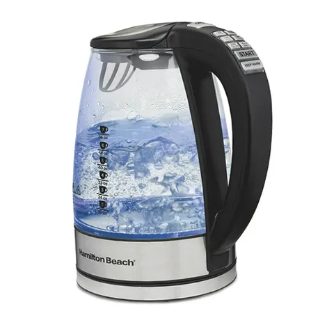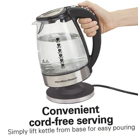 The Hamilton Beach Temperature-Control Glass Kettle provides ultra-fast heating thanks to 1500 watts of power. The Keep Warm setting maintains the water's temperature for 30 minutes until you remove the kettle from the base. The Hamilton Beach Variable Temperature Glass Kettle includes temperature presets for delicate, green, white, oolong and black teas, French press coffee and hot cocoa. You can heat water to a specific temperature with the touch of a button and create your favorite hot beverages with confidence. This attractive 1.7 liter (7 cup) kettle is made of durable borosilicate glass for long-lasting performance, and it has automatic shutoff and boil-dry protection for your peace of mind. Convenient cord-free serving makes it easy to serve beverages at the table, and to make pouring and cleaning easier, the lid opens wide with the press of a button. The spout's mesh filter helps capture hard-water deposits, while the cord wrap makes storage easy and keeps your countertop neat because it adjusts to your ideal length.
