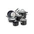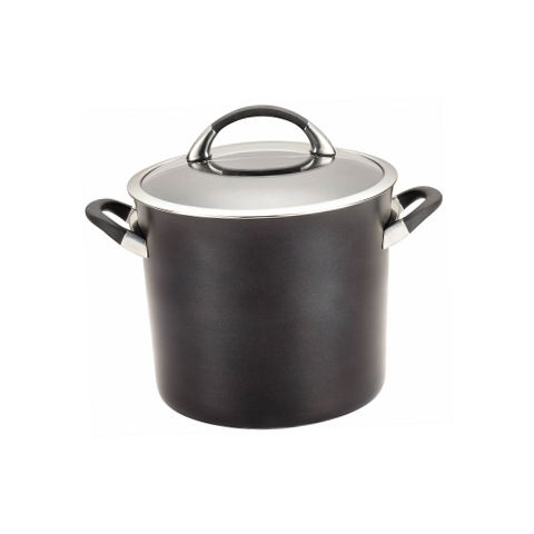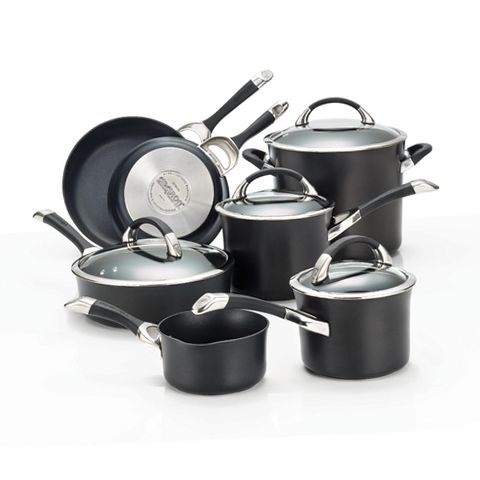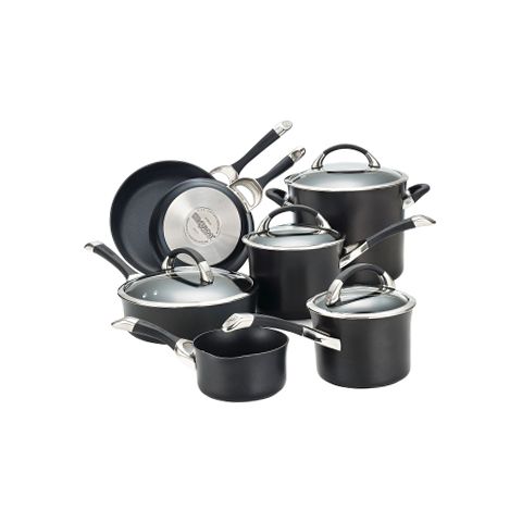 The Circulon Symmetry Hard Anodized Nonstick 11 Piece Cookware Set includes an essential selection of must have pieces for great cooking results. Elegant tulip shapes add sophisticated style to any kitchen, and the heavy duty hard anodized aluminum construction is twice as hard as stainless steel. Each pot and pan boasts the unique TOTAL Food Release System combined with durable, PFOA free metal utensil safe premium quality advanced 3 layer nonstick with raised circles to reduce surface abrasion. This superior nonstick technology provides extraordinary food release without added oils or sprays for egg white scrambles and more, and resists scratching, staining and chipping so steamed baby red potatoes and other vegetables can be mashed in the saucepans. Oven safe to 400F, the cookware is fitted with impact bonded stainless steel bases compatible with all stovetops, including induction. Graceful cast stainless steel handles are enhanced with rubber to provide a comfortable grasp, and the sets stainless steel rimmed, shatter resistant glass lids allow foods to be monitored without heat or moisture loss. This cookware set complements many other items in the Circulon collection and, best of all, is dishwasher safe for the final touch of convenience.