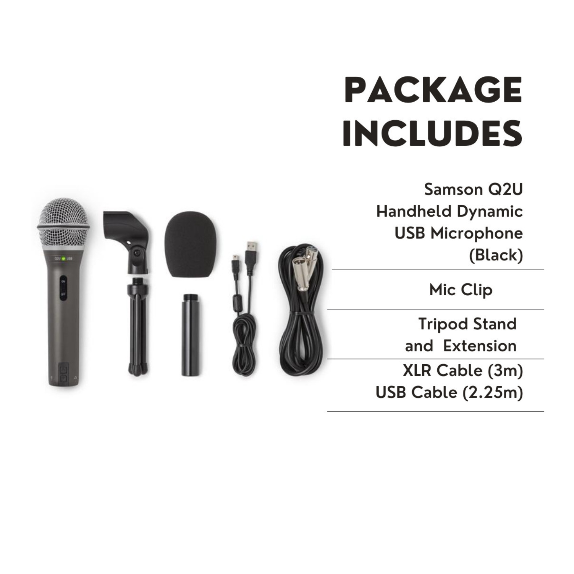 Samson's Q2U combines the convenience of digital and analog audio capture into one dynamic microphone. With XLR and USB outputs, the Q2U is the first choice for home, studio and mobile recording, as well as stage performance. It comes with a mic holder, desktop tripod stand with an extension piece, windscreen, XLR cable and USB cable… A package with everything you need to start recording right out of the box.