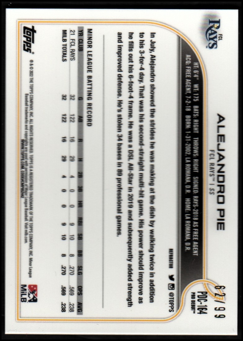 2022 Topps Pro Debut Chrome Refractors #PDC164 Alejandro Pie /99 - NM-MT