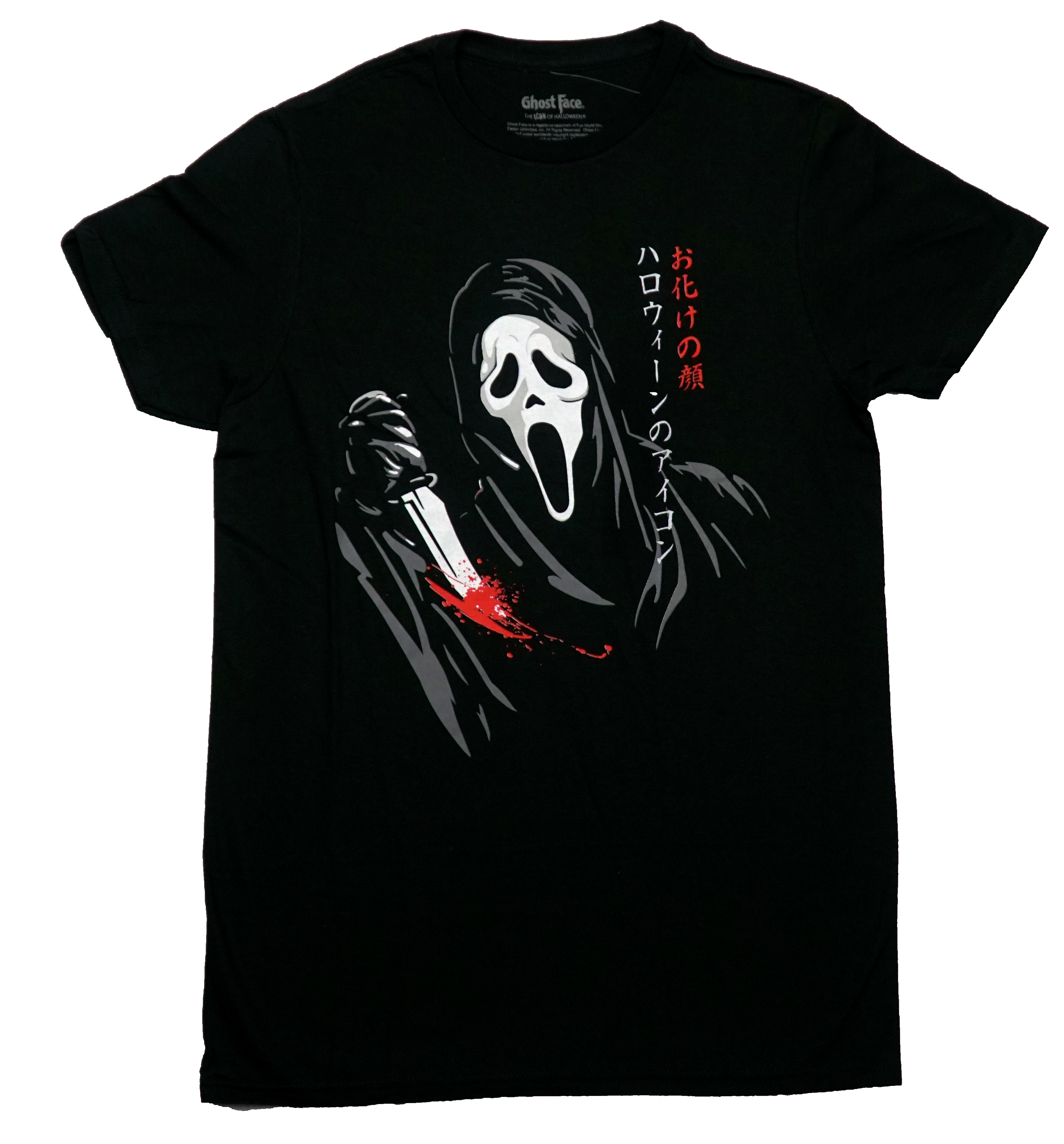 Scream New Adult T-Shirt - Ghostface Holding Bloody Knife Along Kanji