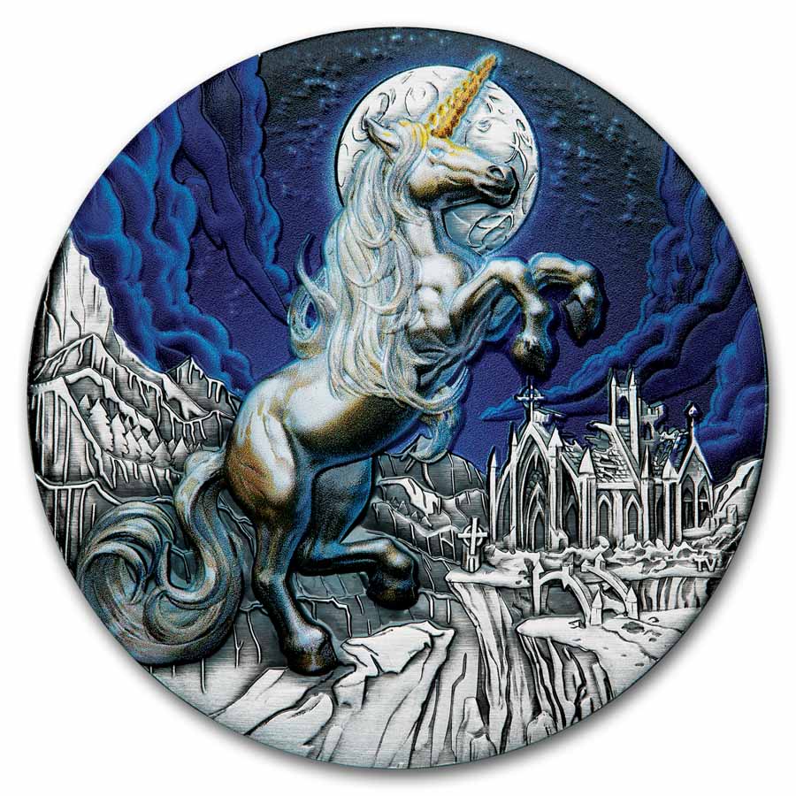 Add this incredible low mintage antiqued 2025 Tuvalu 5 oz Silver Unicorn Colorized & Antiqued coin certified SP-70 High Relief FS by PCGS to your cart today!