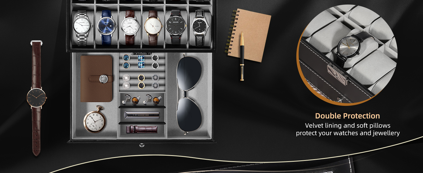 This watch box organizer for men and women's sunder layer offers individual compartments for rings, earrings, bracelets, necklaces, brooches and sun glass to your daily needs perfectly.