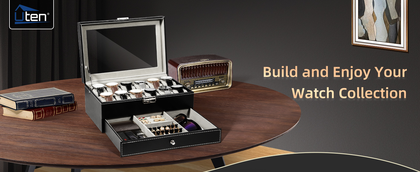 Watch Box 12 Slots PU Leather Watch Display Case with Jewelry Drawer Organizer