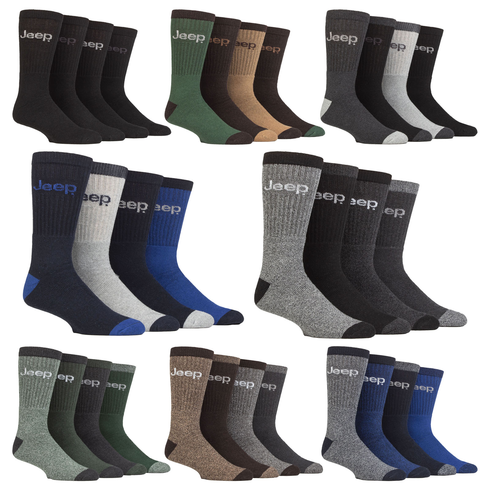 Introducing the Jeep Camo Cotton Boot Socks 4 Pair Pack, crafted with a sustainable blend of 57% Polyester, 41% Cotton, 2% Elastane. These medium thickness boot socks offer ultimate comfort and breathability. The eco-friendly recycled cotton blend, along with strong polyester fibers, ensures a snug fit and warmth, making them perfect for outdoor activities, work, or casual wear.