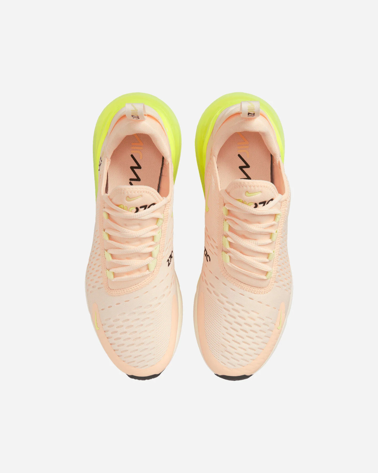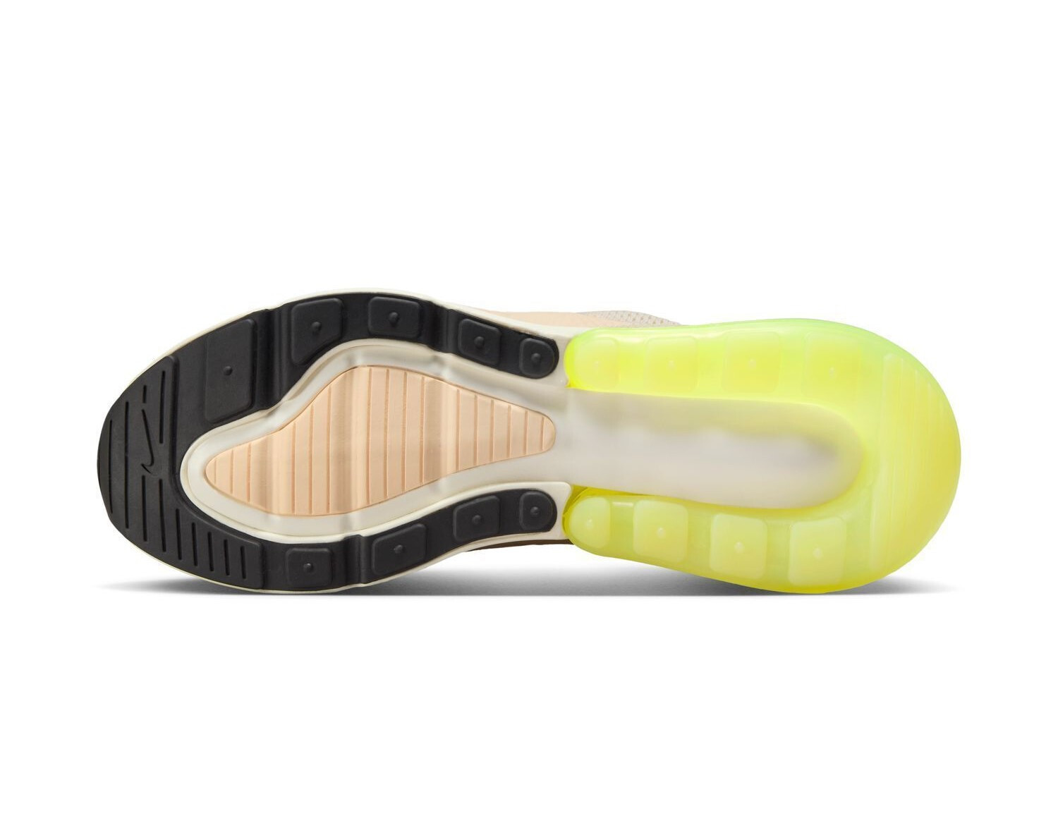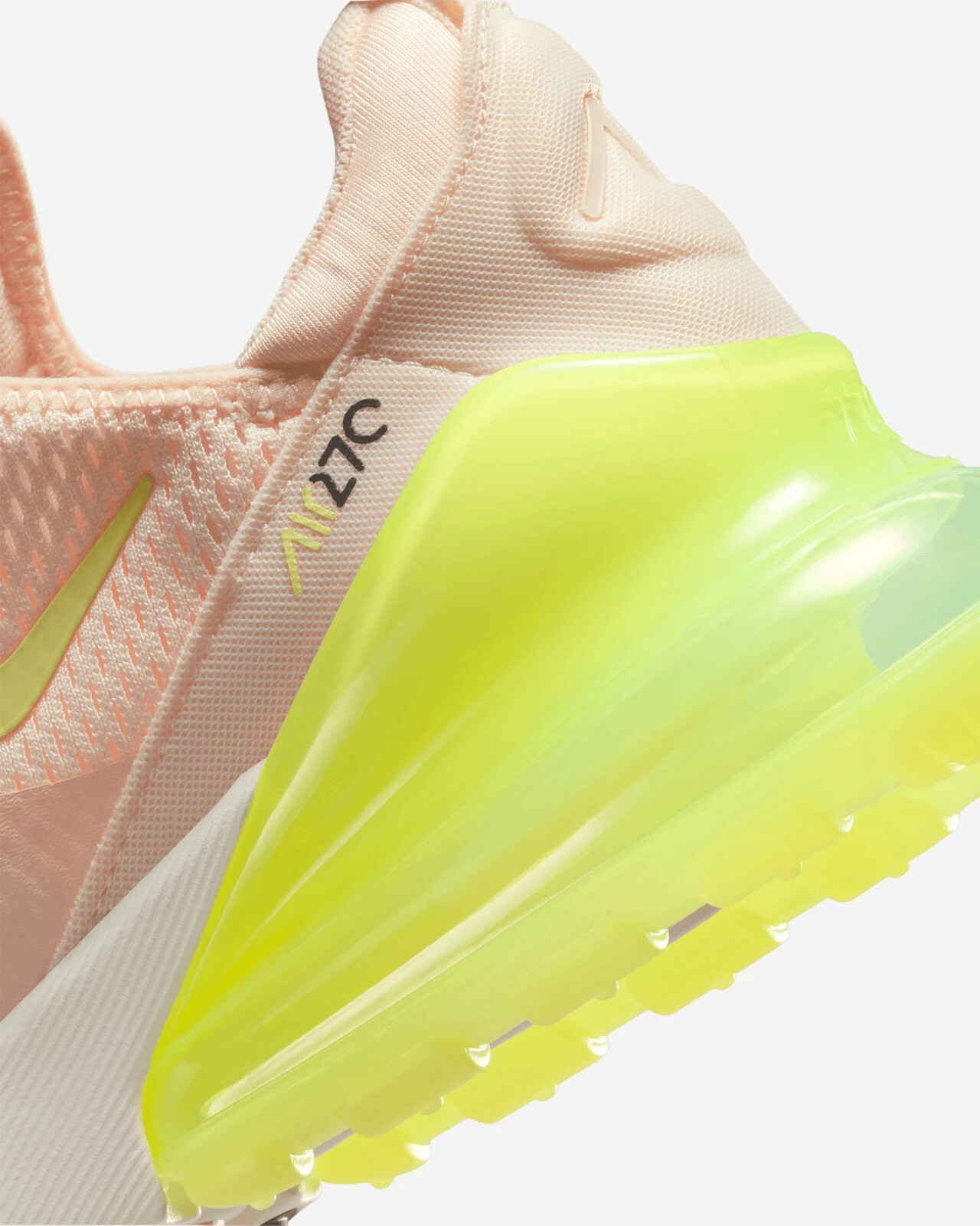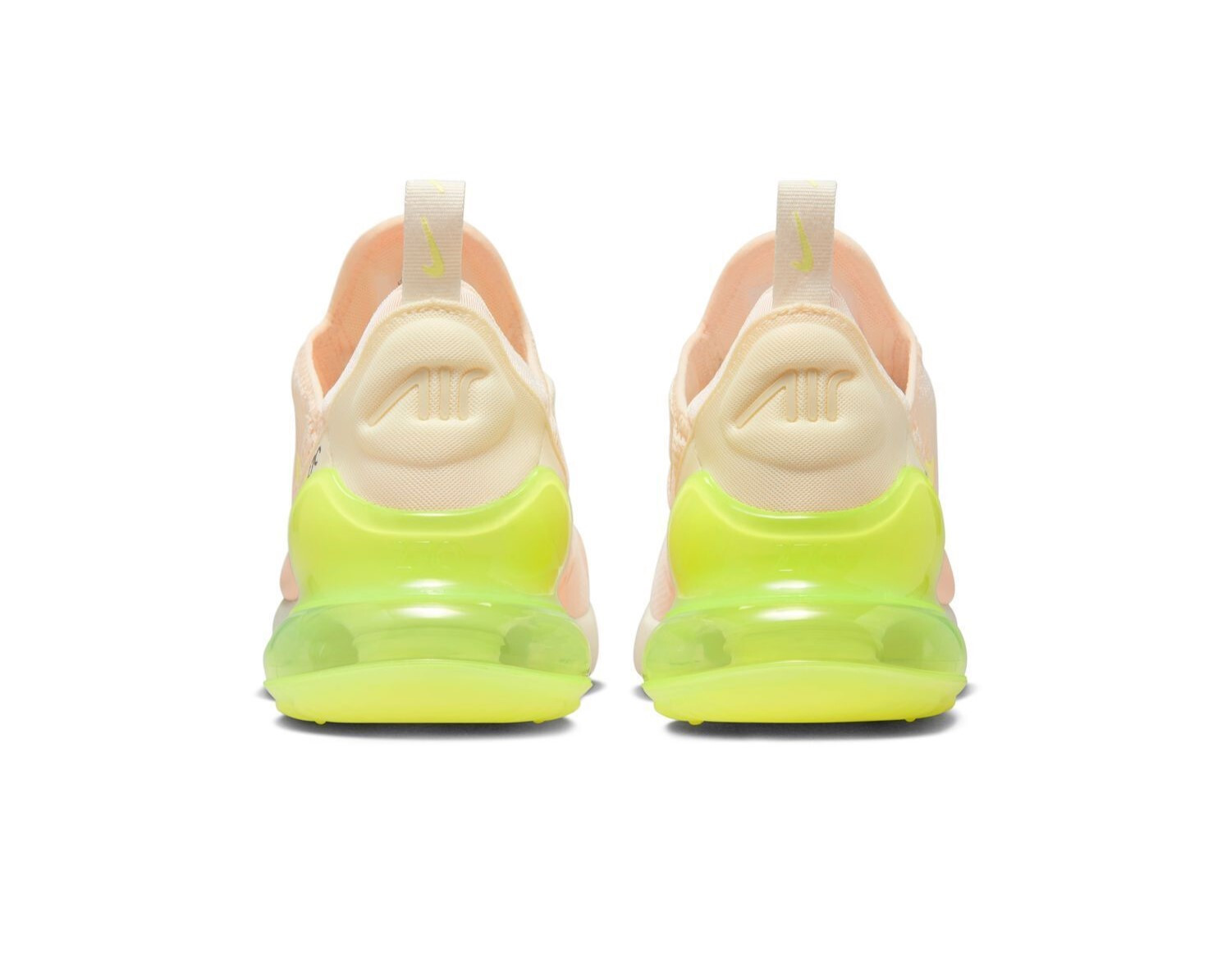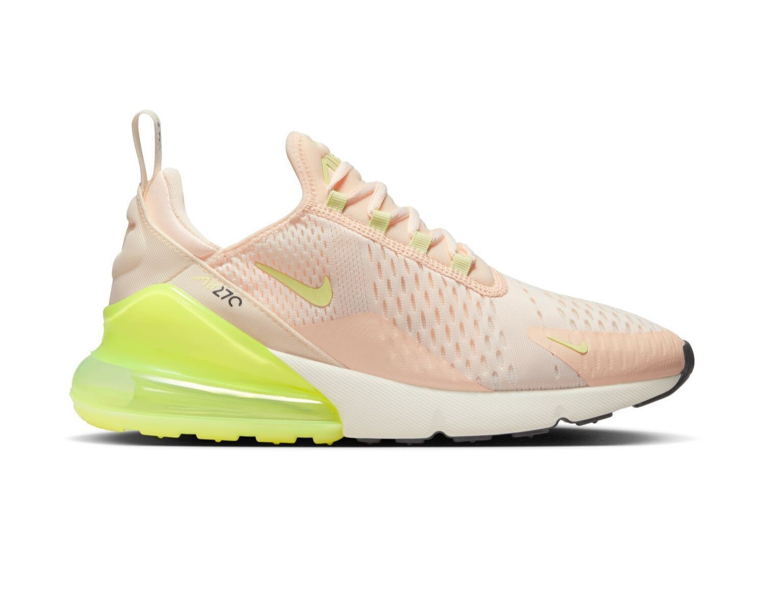 Die Nike Air Max 270 Guava Ice-Sneaker verkörpern eine harmonische Mischung aus Stil und Leistung und zeigen die kontinuierliche Innovation von Nike im Bereich Sportschuhe. Das Obermaterial des Schuhs besteht aus atmungsaktivem Mesh und synthetischen Materialien, die Haltbarkeit und Komfort gewährleisten. Diese Designwahl trägt nicht nur zur strukturellen Unterstützung bei, sondern bietet auch eine elegante, moderne Ästhetik, die sich nahtlos in verschiedene Garderobenoptionen einfügt. Die kontrastierenden, leuchtend gelben Akzente, die strategisch platziert sind, sorgen für einen lebendigen Farbtupfer und lenken die Aufmerksamkeit auf die besonderen Merkmale des Schuhs. Dazu gehören Details an der Ferse, der Zunge und der ikonische Nike Swoosh, die alle zum auffälligen Gesamtbild des Sneakers beitragen.