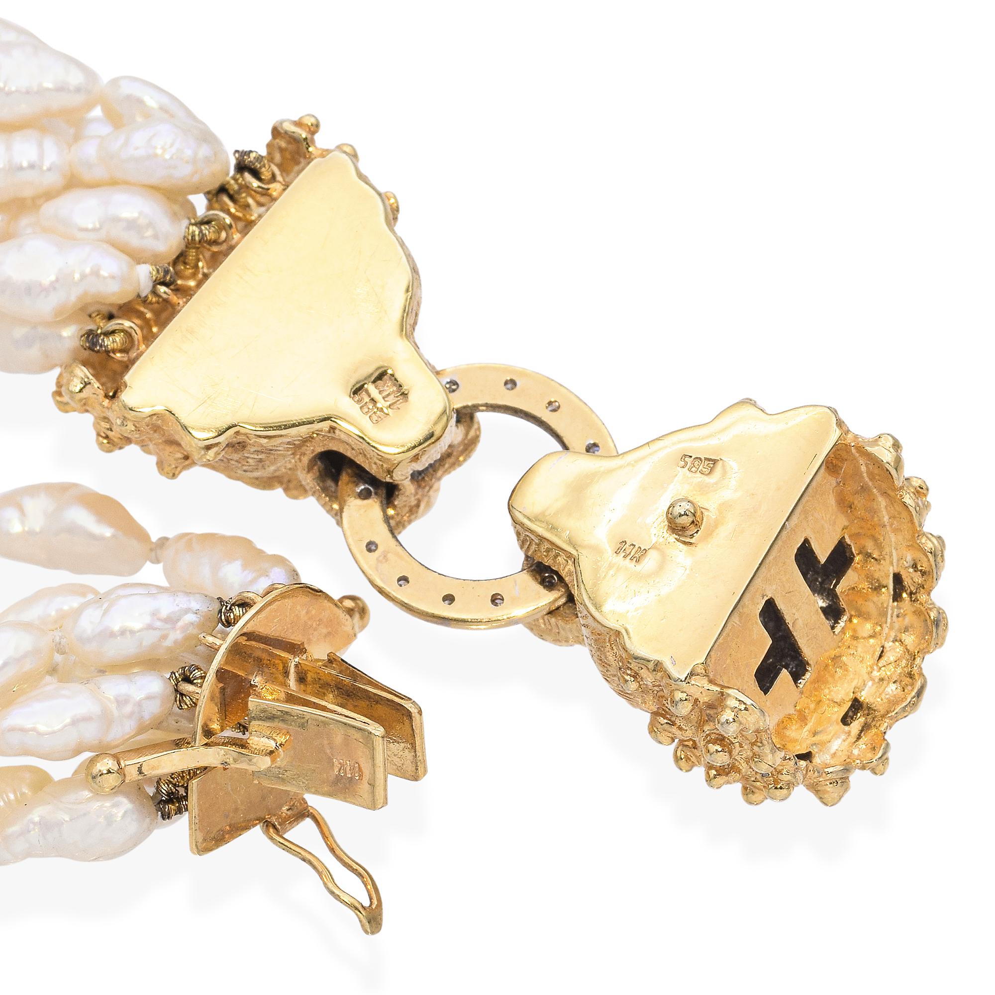Original Cardow Pearl Bracelet with 14K Gold Lion's Head Clasp. This multi strand pearl necklace features lion's head clasp crafted in 14 karat yellow gold set with diamonds and ruby eyes. The clasp has a hidden box style catch that is easy to open and close.