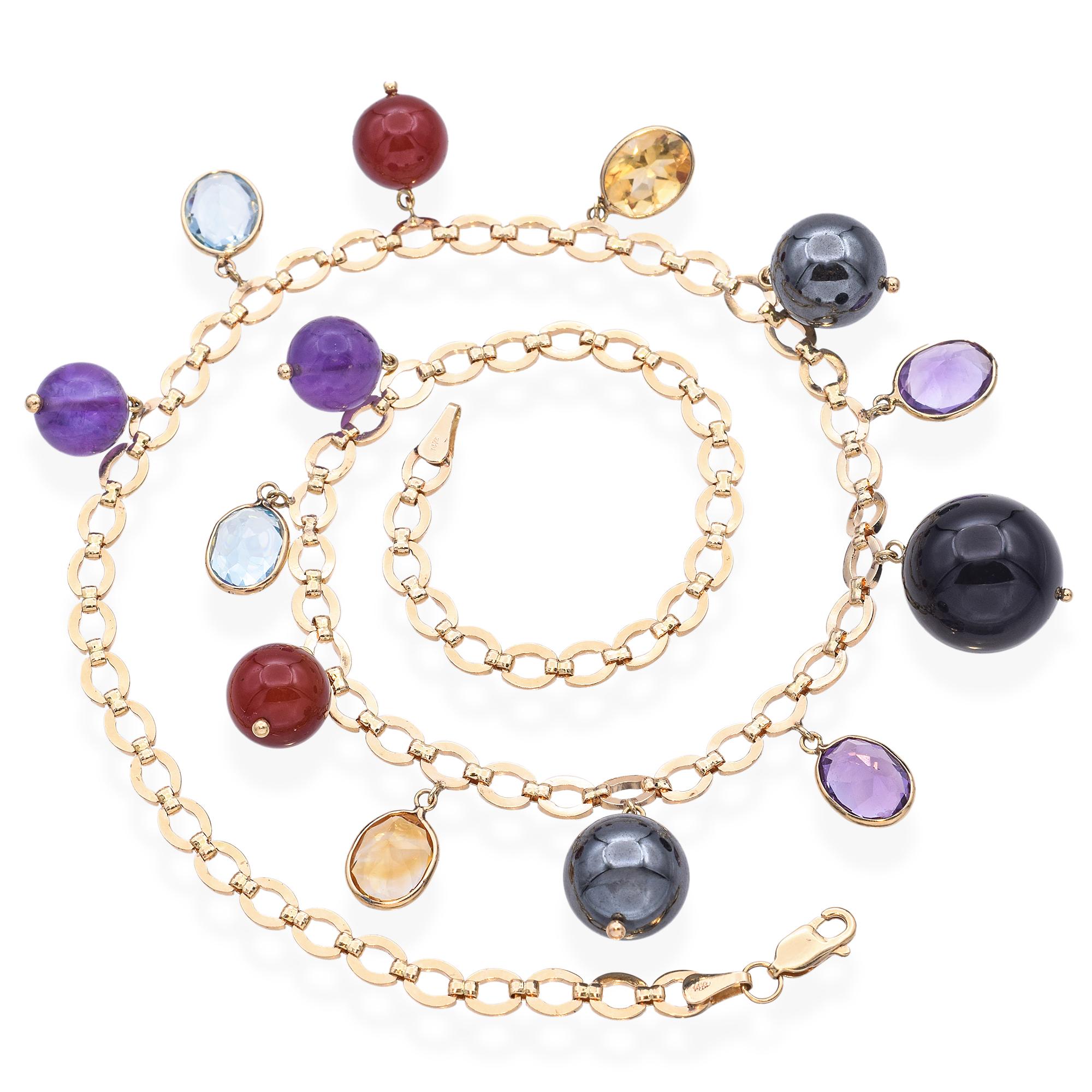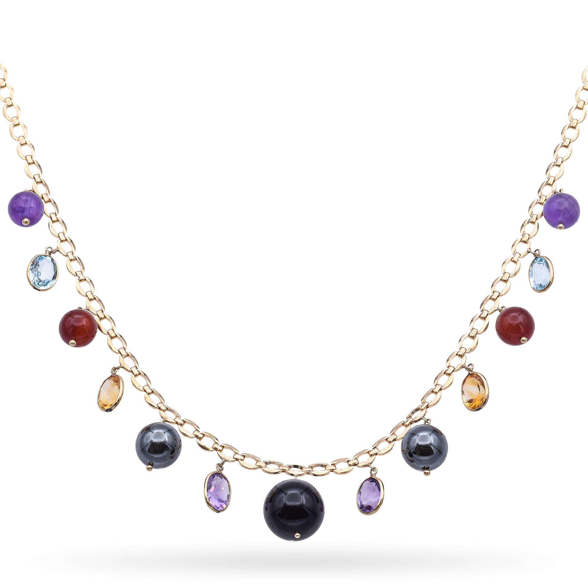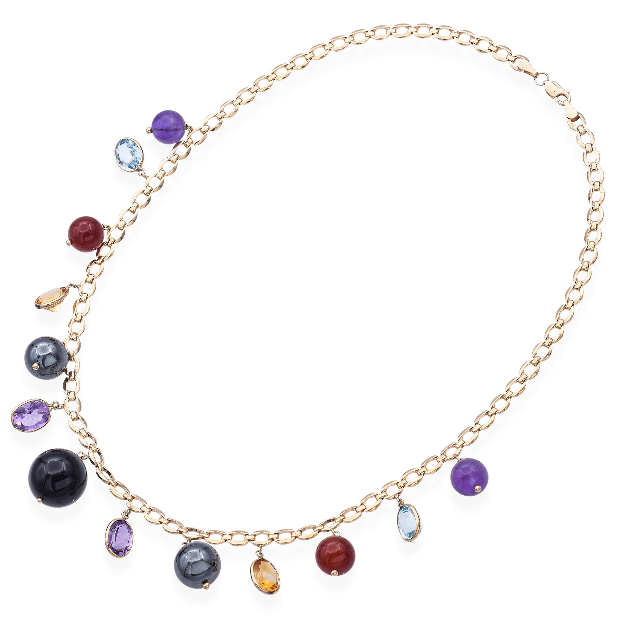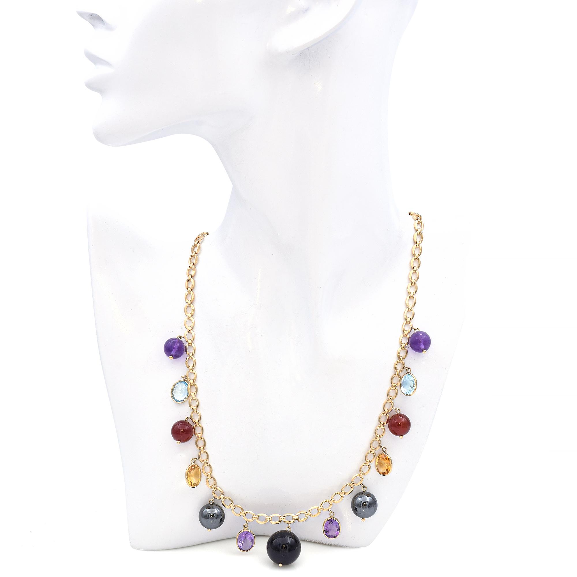 A necklace featuring an assortment of gemstones, each suspended along a 14k yellow gold cable chain.