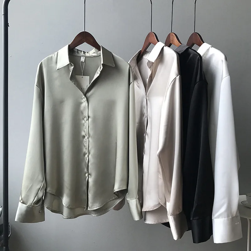 Women Shirt Turn-down Collar Solid Color Satin Blouses Fashion Autumn Office Lady Elegant Tops Spring Long Sleeve Clothing