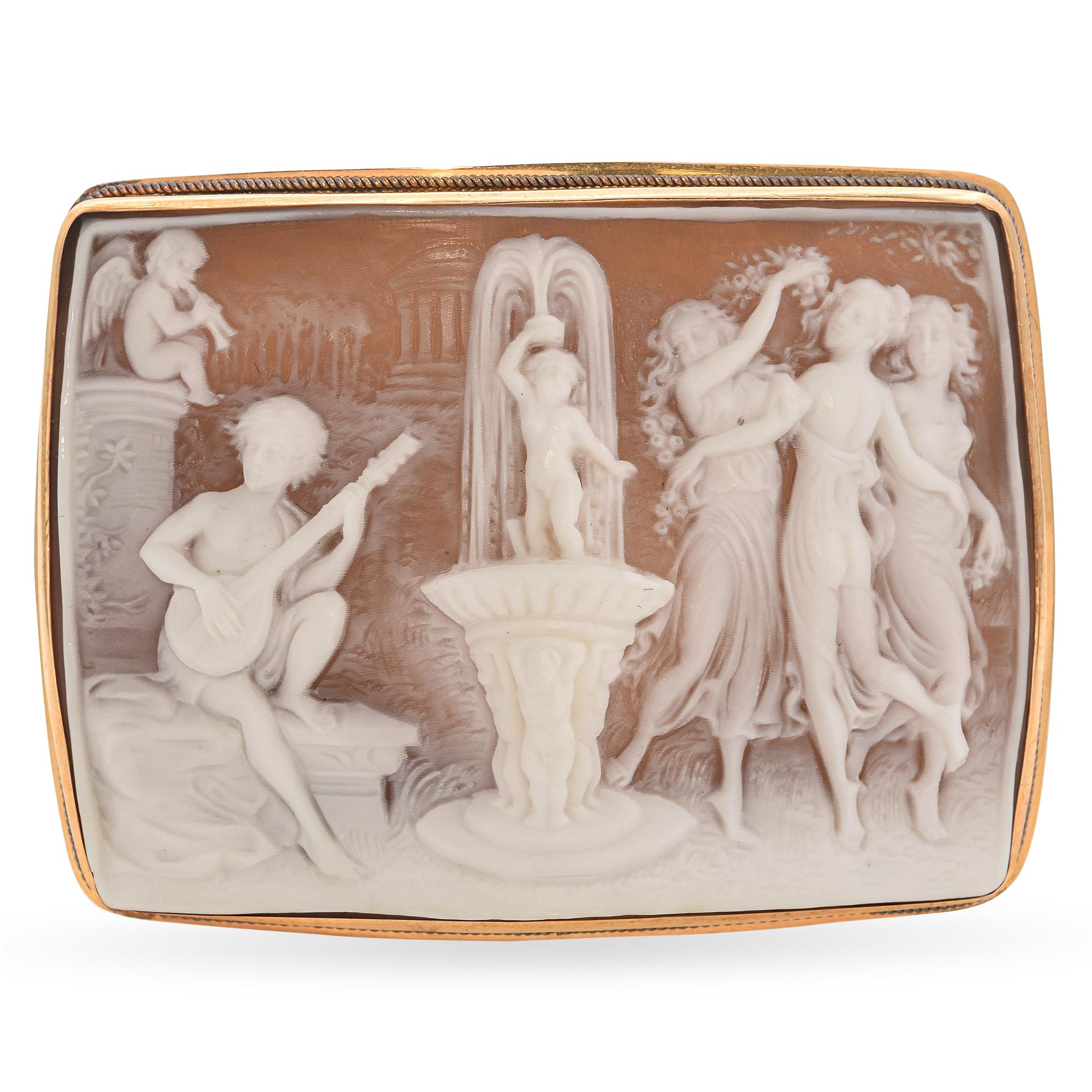 Antique 14k Yellow Gold "Orpheus Playing for Three Graces" Cameo Brooch