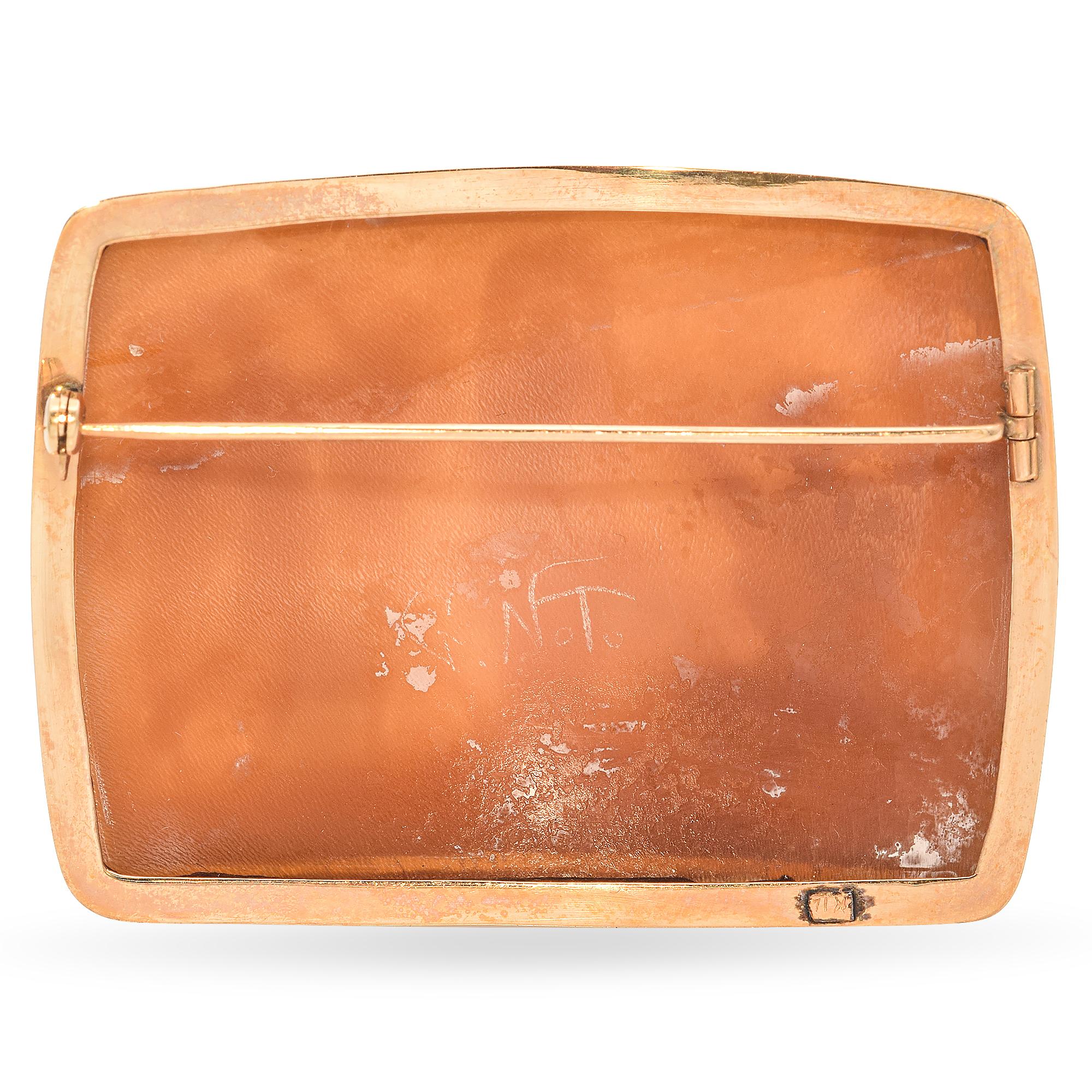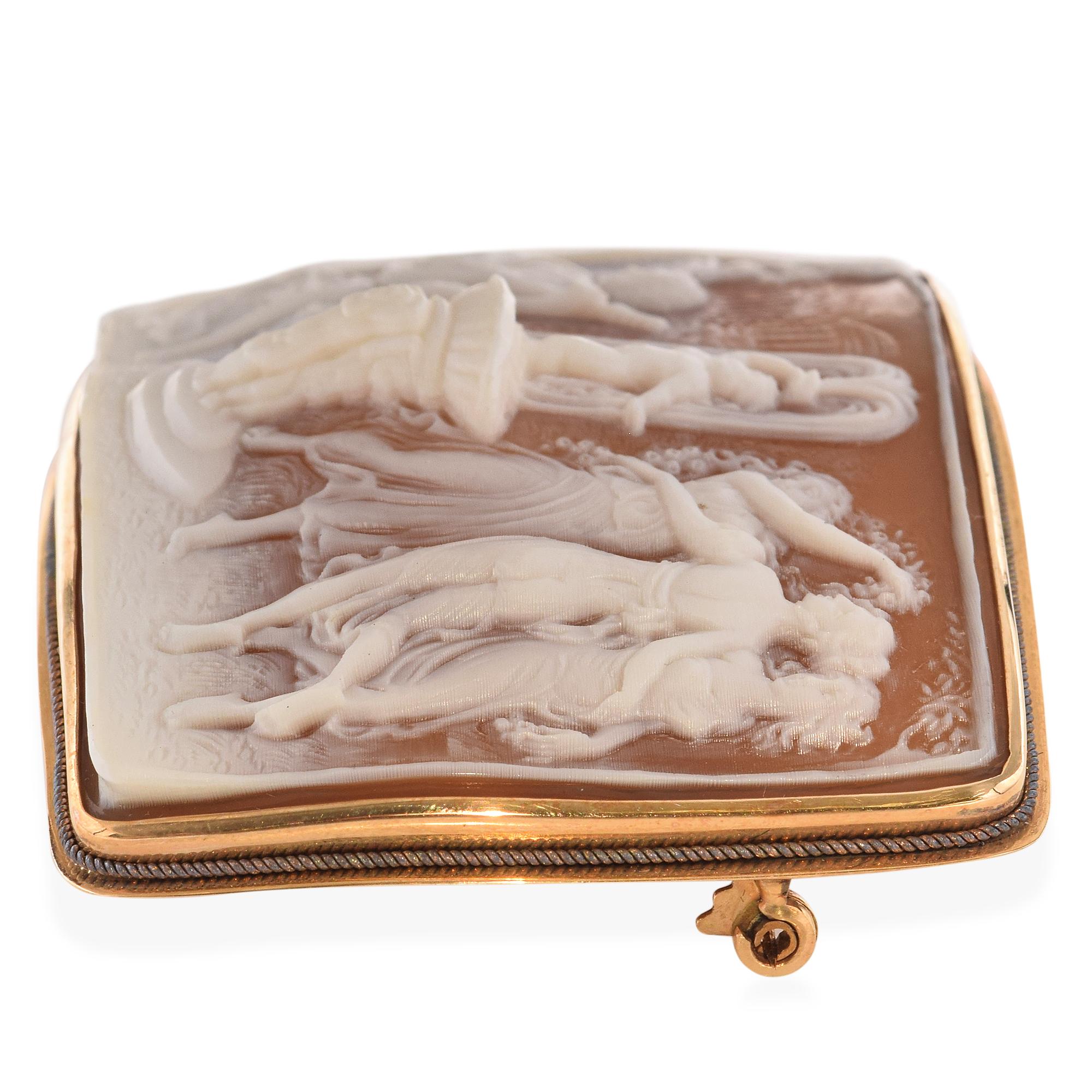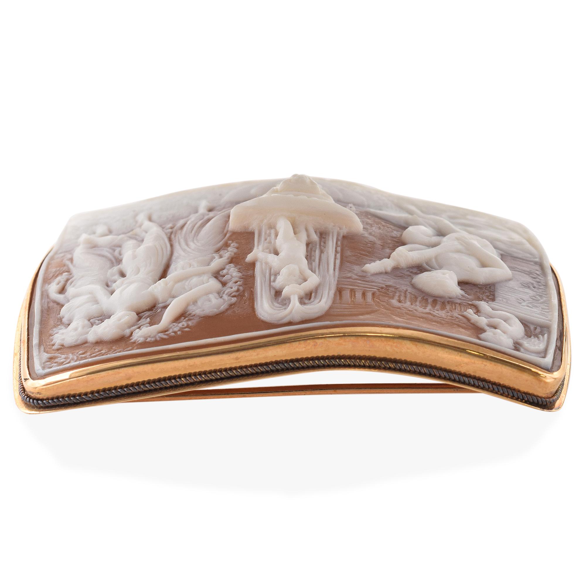 This remarkable antique brooch depicts the mythical poet Orpheus serenading the Three Graces, beautifully carved in high-relief shell and set in a polished 14K yellow gold frame. The scene captures the harmony of music, beauty, and divine inspiration, with intricate detail and classical elegance. A wearable tribute to myth and art, this brooch is a stunning piece for collectors and lovers of neoclassical jewelry.
