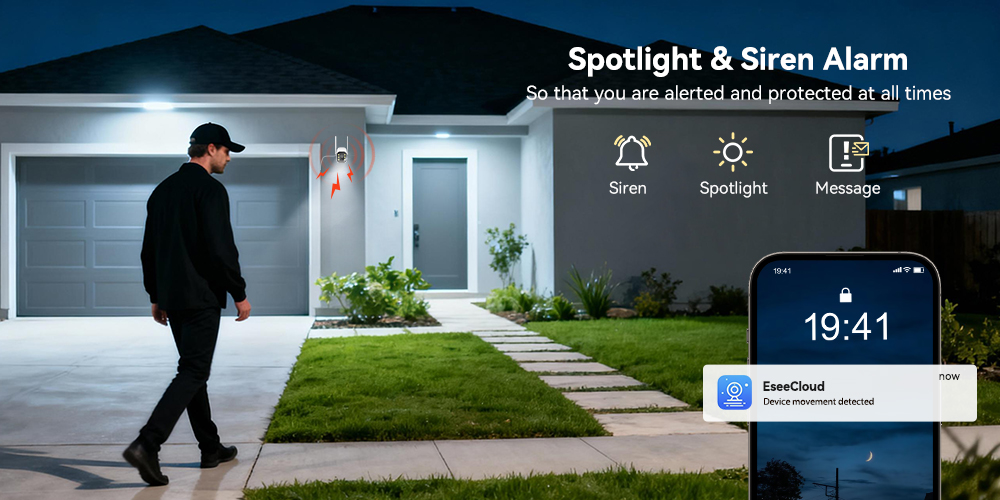 Not only can you access live video and audio streaming, but you can also make audio recordings of suspicious activity. At the same time, the alarm function helps deter uninvited visitors. By installing the free subscription service “Eseecloud” on your smartphone or computer, you can monitor your property at any time.