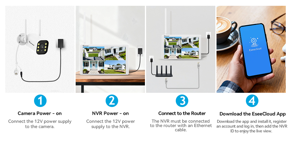 | True Plug and Play Installation If you want a DIY smart security solution, this WiFi security camera system is just the one for you. Plug the cameras & the NVR to the nearby outlets and all is done! No messy cabling, no extra setup - that's the way wireless it should be. |