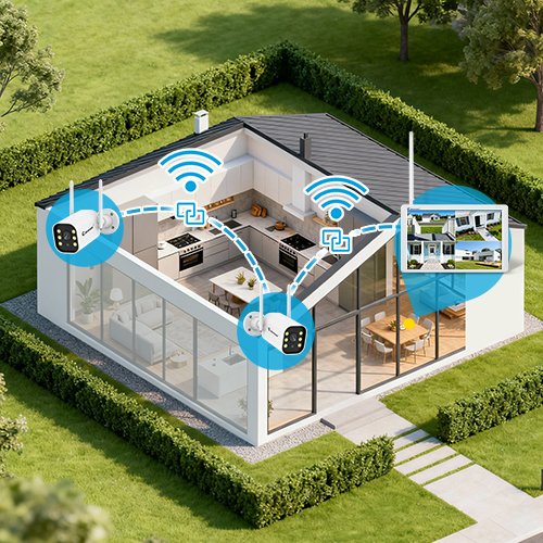 Once connected to power, the Wi-Fi cameras will pair with the NVR automatically without any manual setting. The nearest wifi-connected camera can serve as a repeater to bolster the connection distance. |