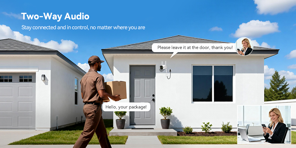 The wireless security camera system comes with advanced noise-filtering microphone and speaker, ensuring clear and fluent voice communication between the app and the cameras. No matter where you are, you can easily share joy with your kids or interact with your pet. It also allows you to keep unwelcome guests at bay