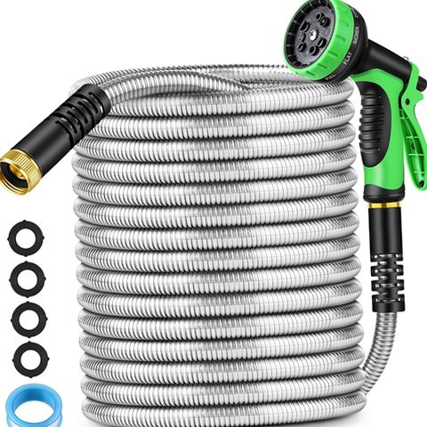 Experience the next level of gardening with the Flyclix 304 Stainless Steel Garden Hose. This innovative hose is crafted from high-quality 304 stainless steel, providing exceptional rust resistance and durability in extreme weather conditions ranging from -40°F to 212°F. Unlike traditional rubber hoses that can crack or degrade over time, the Flyclix hose features a unique helical outer shell that offers three times greater abrasion resistance than standard vinyl hoses. Its self-repairing steel memory core ensures that kinks are a thing of the past, maintaining optimal water flow even when dragged over rough surfaces. The hose's advanced 5-layer ABS inner tube is reinforced with an anti-burst mesh, rated for up to 600PSI burst pressure, making it one of the most robust options available. The UV-resistant TPE shield blocks harmful solar damage, while the puncture-proof matrix protects against dog bites and other sharp objects. Equipped with aerospace-grade aluminum alloy connectors and triple-layer silicone washers, this hose guarantees a leak-proof seal through thousands of connect/disconnect cycles. The ergonomic quick-connect system allows for easy attachment and detachment in seconds. Included with the hose is a versatile 10-pattern nozzle that features non-slip grips for comfort during use. Whether you need a high-pressure jet for car washing or a gentle shower for delicate plants, this nozzle has you covered. Plus, its modular design allows you to connect up to four hoses together for extended reach, making it perfect for larger gardens or outdoor spaces.