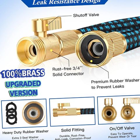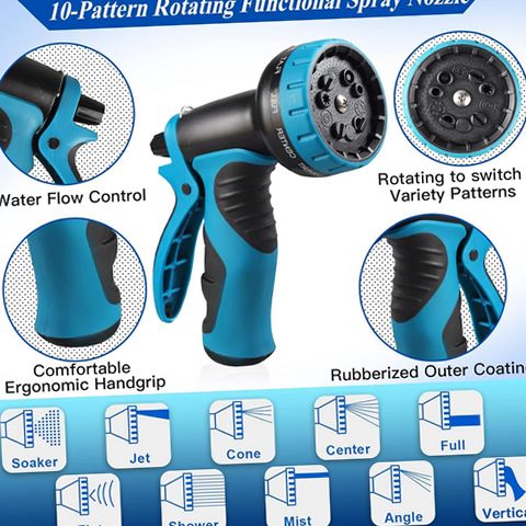 The RUseeN 50ft Expandable Garden Hose is the ultimate solution for all your gardening needs. Constructed with a durable 3-layer latex core and high-quality 2500D polyester fabric, this hose is designed to withstand wear and tear while providing excellent flexibility. It expands up to 50 feet when filled with water, allowing you to reach every corner of your garden without hassle. The hose features a solid 3/4 inch connector that ensures a leakproof experience, so you can water your plants without worrying about drips or breaks. The included nozzle offers 10 different functions, including soaker, jet, cone, center, full, flat, shower, mist, angle, and vertical sprays, catering to all your watering requirements. Whether you need a gentle spray for delicate flowers or a strong jet for cleaning purposes, this hose has you covered. Withstanding temperatures as low as -4℉ and as high as 122℉ makes it suitable for various climates. Plus, the package includes a black hanging hook for easy storage and a nylon pouch for portability. Say goodbye to tangled hoses and hello to efficient gardening with the RUseeN Expandable Garden Hose!