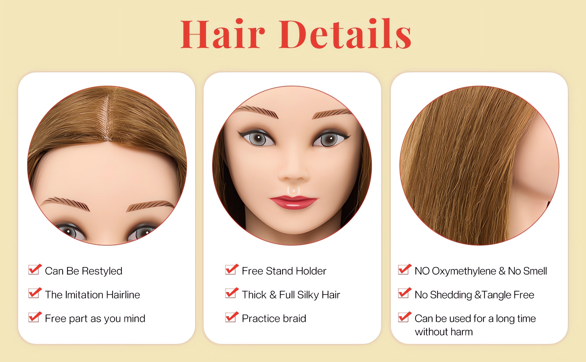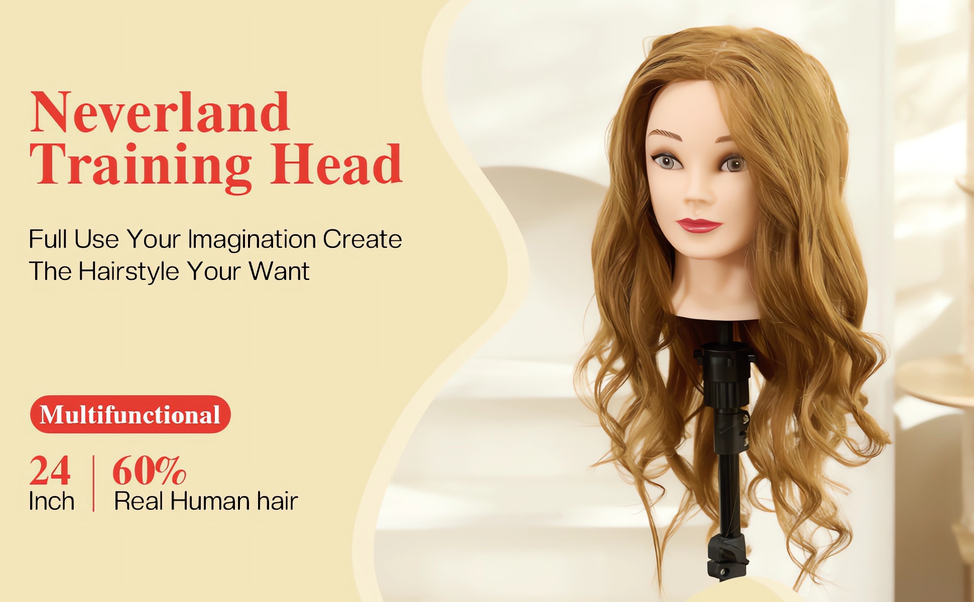【Hohe Qualität】 – Frisierkopf mit 22-24 Zoll langen Haaren, hergestellt aus 60 % Echthaar. Die Haare können geglättet, gebügelt, stylisiert, geflochten und frisiert werden. Sie können die Frisur frei gestalten.