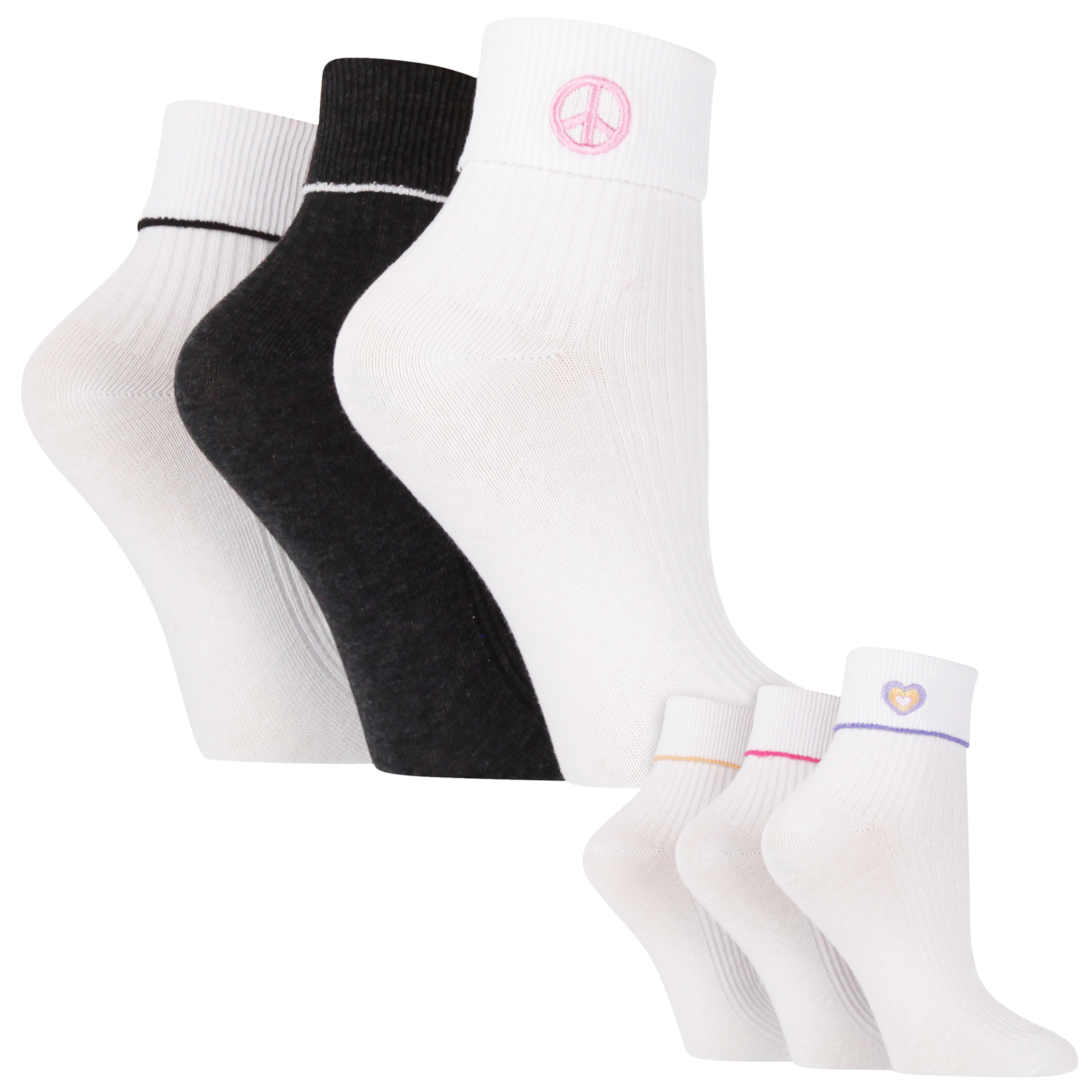 There are 2 designs to choose from: Heart or Peace. They come in one size Ladies 5-9 US, are made from 71% Cotton, 26% Polyester, 3% Elastane and are machine washable.
